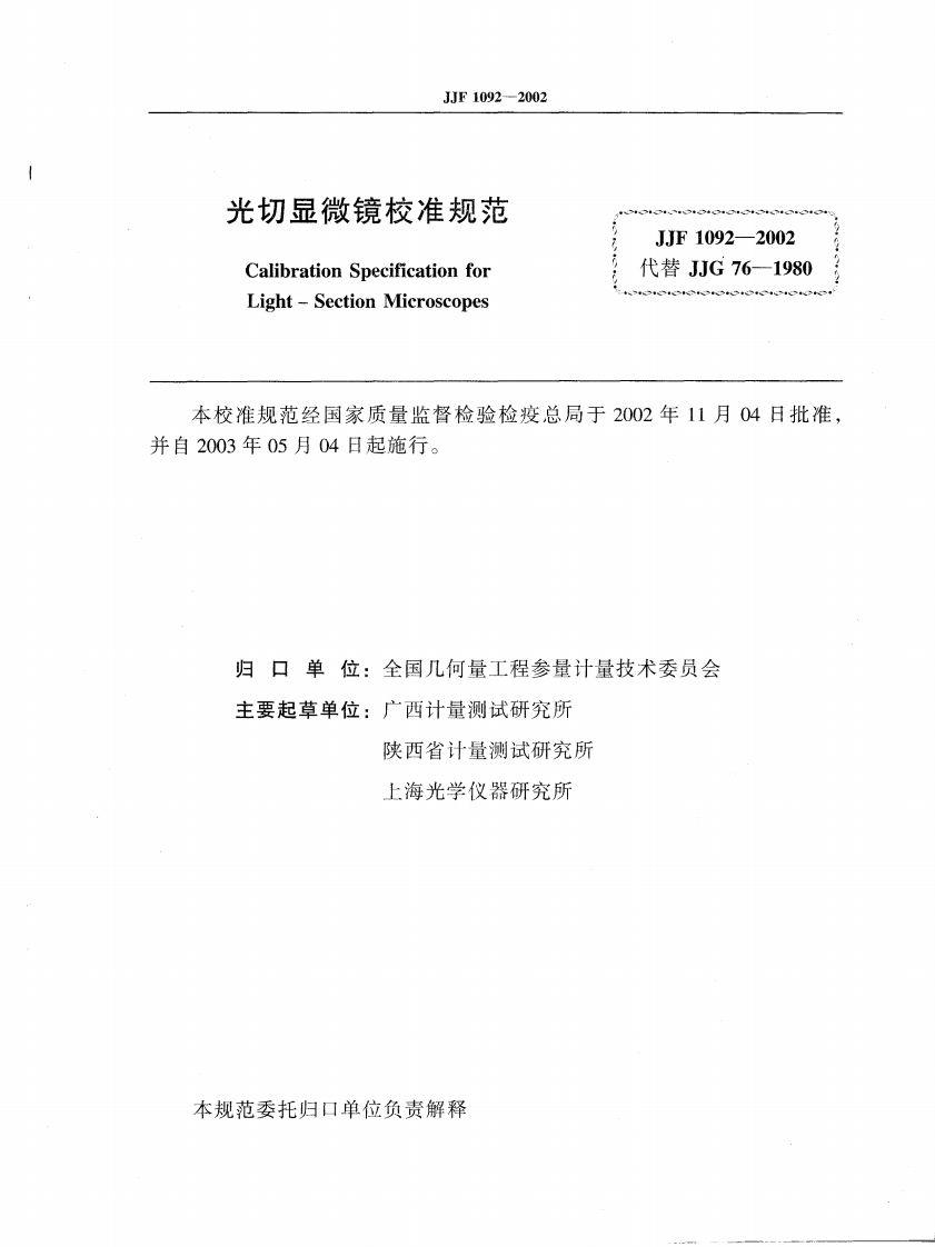 JJF1092-2002光切显微镜校准规范348072@abc4个月前发布关注私信0.46MB14页046JJF1092-2002光切显微镜校准规范此内容为付费资源,请付费后查看¥16¥23黄金会员免费钻石会员免费立即购买您当前未登录!建议登陆后购买,可保存购买订单付费资源 第1页 / 共14页 第2页 / 共14页 试读已结束,还剩12页,您可下载完整版后进行离线阅读 THE END标准规范 文本预览 D437可可月中华人民共和国国家计量技术规范JJF1092-2002光切显微镜校准规范Calibration Specification for Light-Section Microscopes2002-11-04发布2003-05-04实施国家质量监督检验检疫总局发布 查看更多 收起部分 喜欢就支持一下吧收藏
