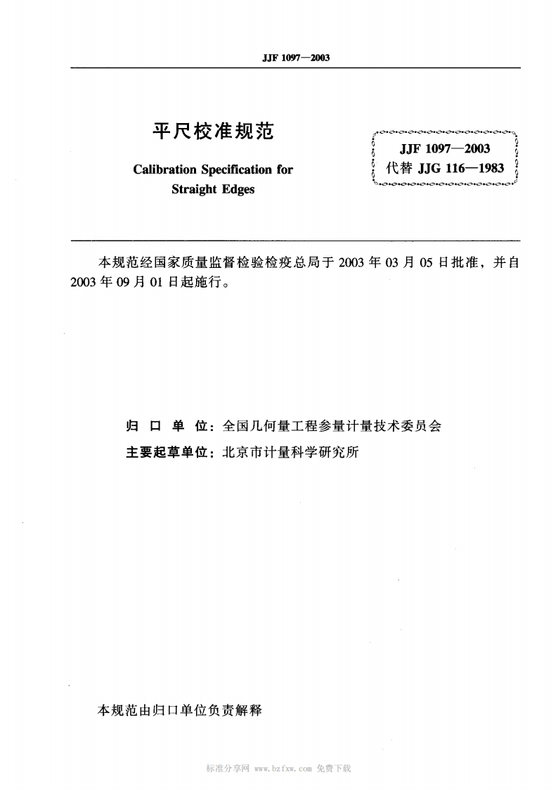 JJF1097-2003平尺校准规范348072@abc4个月前发布关注私信0.31MB15页034JJF1097-2003平尺校准规范此内容为付费资源,请付费后查看¥16¥23黄金会员免费钻石会员免费立即购买您当前未登录!建议登陆后购买,可保存购买订单付费资源 第1页 / 共15页 第2页 / 共15页 试读已结束,还剩13页,您可下载完整版后进行离线阅读 THE END标准规范 文本预览 可可月中华人民共和国国家计量技术规范JJF1097一2003平尺校准规范Calibration Specification for Straight Edges2003-03-05发布2003-09-01实施国家质量监督检验检疫总局发布 查看更多 收起部分 喜欢就支持一下吧收藏