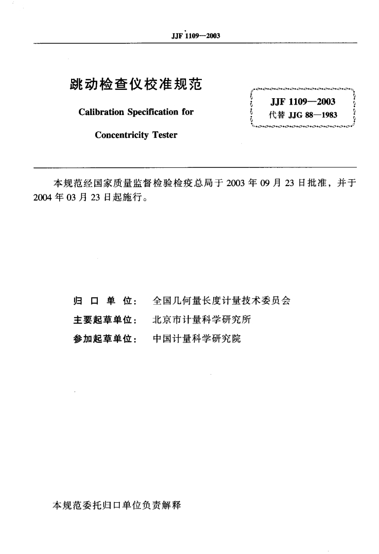 JJF1109-2003跳动检查仪校准规范348072@abc4个月前发布关注私信0.16MB9页030JJF1109-2003跳动检查仪校准规范此内容为付费资源,请付费后查看¥16¥23黄金会员免费钻石会员免费立即购买您当前未登录!建议登陆后购买,可保存购买订单付费资源 第1页 / 共9页 第2页 / 共9页 试读已结束,还剩7页,您可下载完整版后进行离线阅读 THE END标准规范 文本预览 可可F中华人民共和国国家计量技术规范JJF1109-2003跳动检查仪校准规范Calibration Specification for Concentricity Tester2003-09-23发布2004-03-23实施国家质量监督检验检疫总局发布 查看更多 收起部分 喜欢就支持一下吧收藏