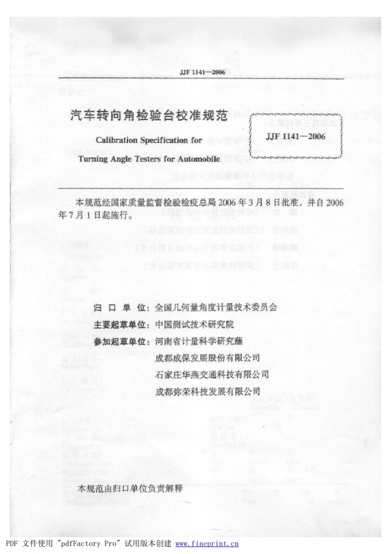 JJF1141-2006汽车转向角检验台校准规范348072@abc4个月前发布关注私信0.99MB13页024JJF1141-2006汽车转向角检验台校准规范此内容为付费资源,请付费后查看¥16¥23黄金会员免费钻石会员免费立即购买您当前未登录!建议登陆后购买,可保存购买订单付费资源 第1页 / 共13页 第2页 / 共13页 试读已结束,还剩11页,您可下载完整版后进行离线阅读 THE END标准规范 文本预览 U作中华人民共和国国家计量技术规范JJF1141-2006汽车转向角检验台校准规范Calibration Specification forTurning Angle Testers for Automobile2006-03-08发布2006-07-01实施国家质量监督检验检疫总局发布PDF文件使用"pdfFactory Pro”试用版本创建ww.fineprint.cn 查看更多 收起部分 喜欢就支持一下吧收藏