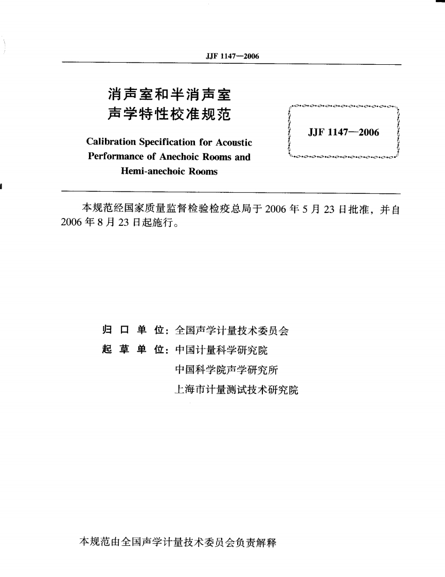 JJF1147-2006消声室和半消声室声学特性校准规范348072@abc4个月前发布关注私信0.58MB21页050JJF1147-2006消声室和半消声室声学特性校准规范此内容为付费资源,请付费后查看¥16¥23黄金会员免费钻石会员免费立即购买您当前未登录!建议登陆后购买,可保存购买订单付费资源 第1页 / 共21页 第2页 / 共21页 试读已结束,还剩19页,您可下载完整版后进行离线阅读 THE END标准规范 文本预览 可可月中华人民共和国国家计量技术规范JJF1147一2006消声室和半消声室声学特性校准规范Calibration Specification for Acoustic Performance of AnechoicRooms and Hemi-anechoic Rooms2006-05-23发布26国家质量监督检验检疫总局发布 查看更多 收起部分 喜欢就支持一下吧收藏