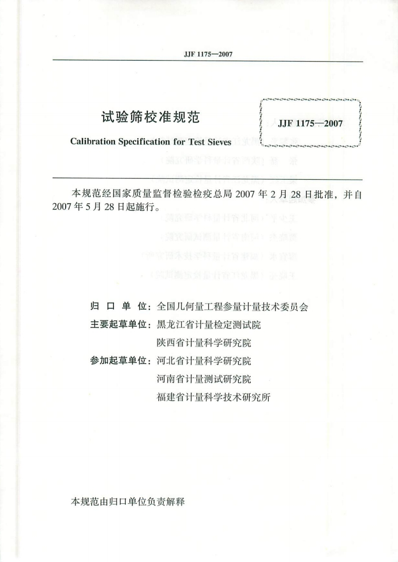 JJF1175-2007试验筛校准规范348072@abc4个月前发布关注私信3.49MB20页046JJF1175-2007试验筛校准规范此内容为付费资源,请付费后查看¥16¥23黄金会员免费钻石会员免费立即购买您当前未登录!建议登陆后购买,可保存购买订单付费资源 第1页 / 共20页 第2页 / 共20页 试读已结束,还剩18页,您可下载完整版后进行离线阅读 THE END标准规范 文本预览 可月中华人民共和国国家计量技术规范JJF1175-2007试验筛校准规范Calibration Specification for Test Sieves2007-02-28发布2007-05-28实施国家质量监督检验检疫总局发布 查看更多 收起部分 喜欢就支持一下吧收藏
