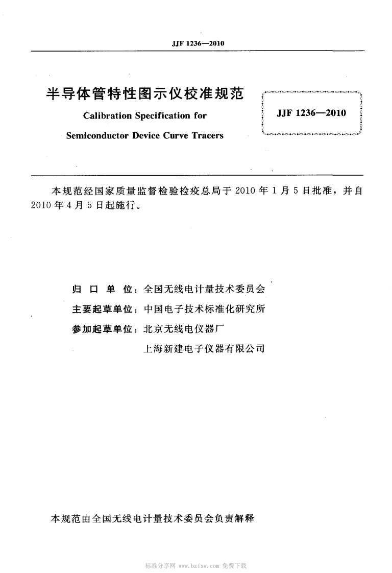 JJF1236-2010半导体管特性图示仪校准规范348072@abc4个月前发布关注私信0.52MB26页040JJF1236-2010半导体管特性图示仪校准规范此内容为付费资源,请付费后查看¥16¥23黄金会员免费钻石会员免费立即购买您当前未登录!建议登陆后购买,可保存购买订单付费资源 第1页 / 共26页 第2页 / 共26页 试读已结束,还剩24页,您可下载完整版后进行离线阅读 THE END标准规范 文本预览 可P中华人民共和国国家计量技术规范JJF1236-2010半导体管特性图示仪校准规范Calibration Specification for Semiconductor Device Curve Tracers2010-01-05发布2010一04-05实施国家质量监督检验检疫总局发布 查看更多 收起部分 喜欢就支持一下吧收藏