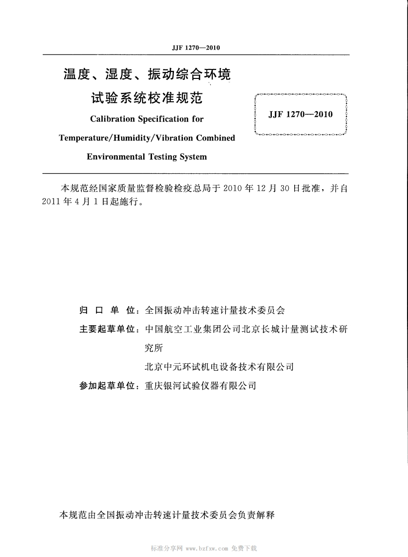 JJF1270-2010温度、湿度、振动综合环境试验系统校准规范348072@abc4个月前发布关注私信1.02MB20页041JJF1270-2010温度、湿度、振动综合环境试验系统校准规范此内容为付费资源,请付费后查看¥16¥23黄金会员免费钻石会员免费立即购买您当前未登录!建议登陆后购买,可保存购买订单付费资源 第1页 / 共20页 第2页 / 共20页 试读已结束,还剩18页,您可下载完整版后进行离线阅读 THE END标准规范 文本预览 可可手中华人民共和国国家计量技术规范JJF1270-2010温度、湿度、振动综合环境试验系统校准规范Calibration Specification for Temperature/Humidity/VibrationCombined Environmental Testing System2010-12-30发布2011-04-01实施Φ国家质量监督检验检疫总局发布 查看更多 收起部分 喜欢就支持一下吧收藏