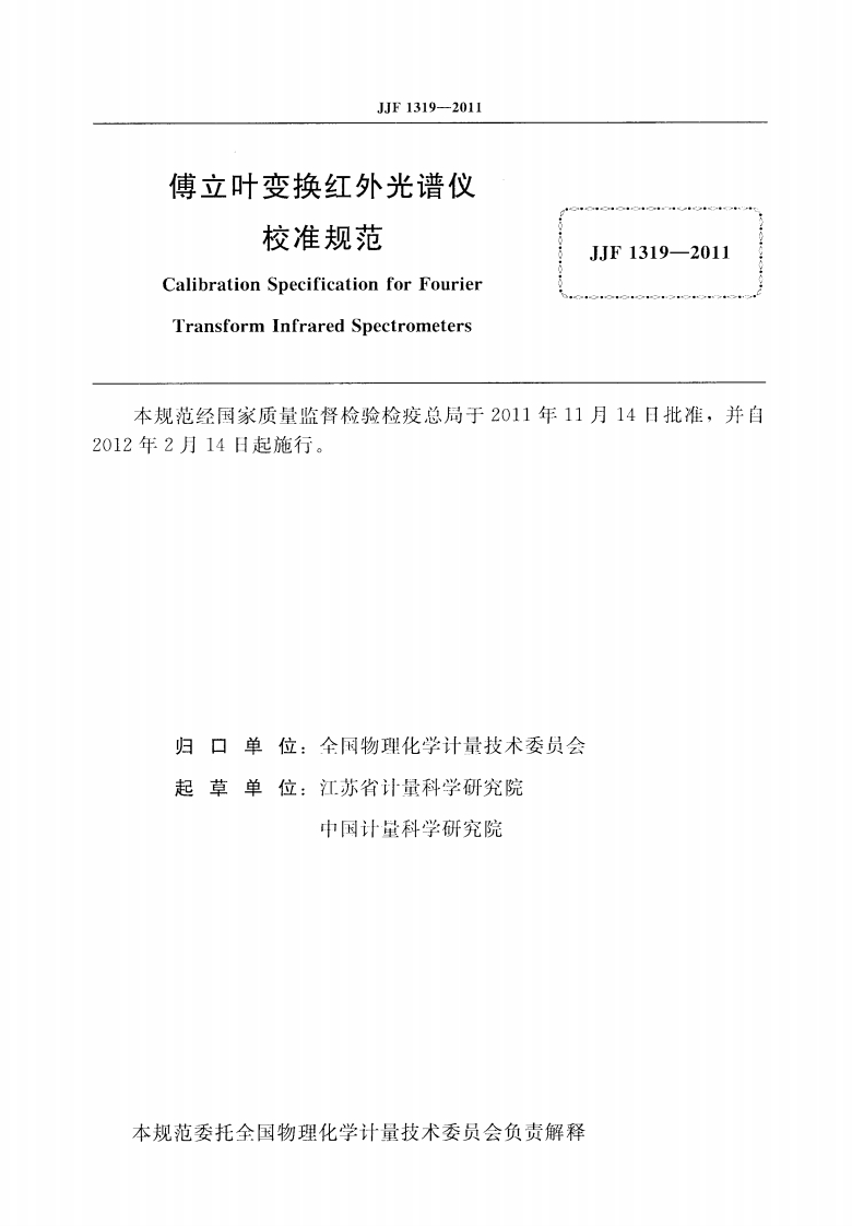 JJF1319-2011傅立叶变换红外光谱仪校准规范348072@abc4个月前发布关注私信1.13MB18页043JJF1319-2011傅立叶变换红外光谱仪校准规范此内容为付费资源,请付费后查看¥16¥23黄金会员免费钻石会员免费立即购买您当前未登录!建议登陆后购买,可保存购买订单付费资源 第1页 / 共18页 第2页 / 共18页 试读已结束,还剩16页,您可下载完整版后进行离线阅读 THE END标准规范 文本预览 JJF中华人民共和国国家计量技术规范JJF1319—2011傅立叶变换红外光谱仪校准规范Calibration Specification for Fourier TransformInfrared Spectrometers2011-11-14发布2012-02-14实施国家质量监督检验检疫总局发布数码防伪 查看更多 收起部分 喜欢就支持一下吧收藏