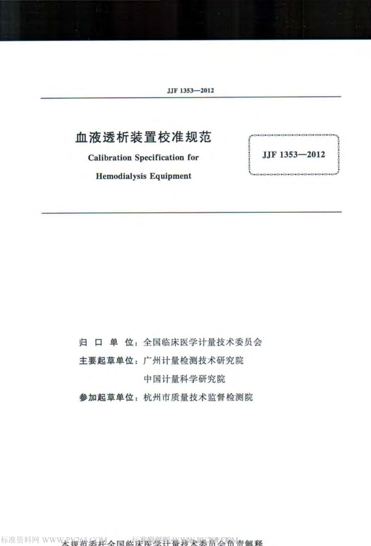 JJF1353-2012血液透析装置校准规范348072@abc4个月前发布关注私信1.86MB23页029JJF1353-2012血液透析装置校准规范此内容为付费资源,请付费后查看¥16¥23黄金会员免费钻石会员免费立即购买您当前未登录!建议登陆后购买,可保存购买订单付费资源 第1页 / 共23页 第2页 / 共23页 试读已结束,还剩21页,您可下载完整版后进行离线阅读 THE END标准规范 文本预览 可可F中华人民共和国国家计量技术规范JJF1353-2012血液透析装置校准规范Calibration Specification for Hemodialysis Equipment2012-06-18发布2012-09-18实施国家质量监督检验检疫总局发布标准资料网VWW PV265COM标准资料网VWW PV265COM 查看更多 收起部分 喜欢就支持一下吧收藏