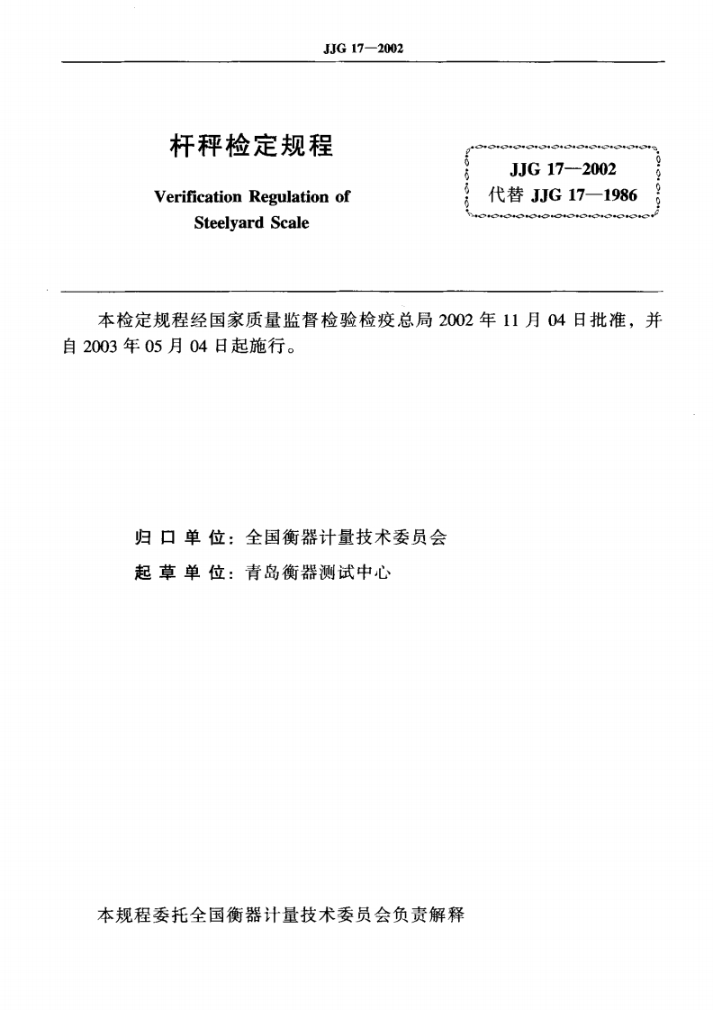 JJG17-2002杆秤348072@abc2个月前发布关注私信0.36MB15页03715JJG17-2002杆秤此内容为付费资源,请付费后查看¥16¥23黄金会员免费钻石会员免费立即购买您当前未登录!建议登陆后购买,可保存购买订单付费资源 第1页 / 共15页 第2页 / 共15页 试读已结束,还剩13页,您可下载完整版后进行离线阅读 © 版权声明文章版权归作者所有,未经允许请勿转载。THE END标准规范 文本预览 JJG中华人民共和国国家计量检定规程JJG17一2002杆秤Steelyard Scale2002-11-04发布2003-05-04实施国家质量监督检验检疫总局发布 查看更多 收起部分 喜欢就支持一下吧点赞15 分享QQ空间微博QQ好友海报分享复制链接收藏