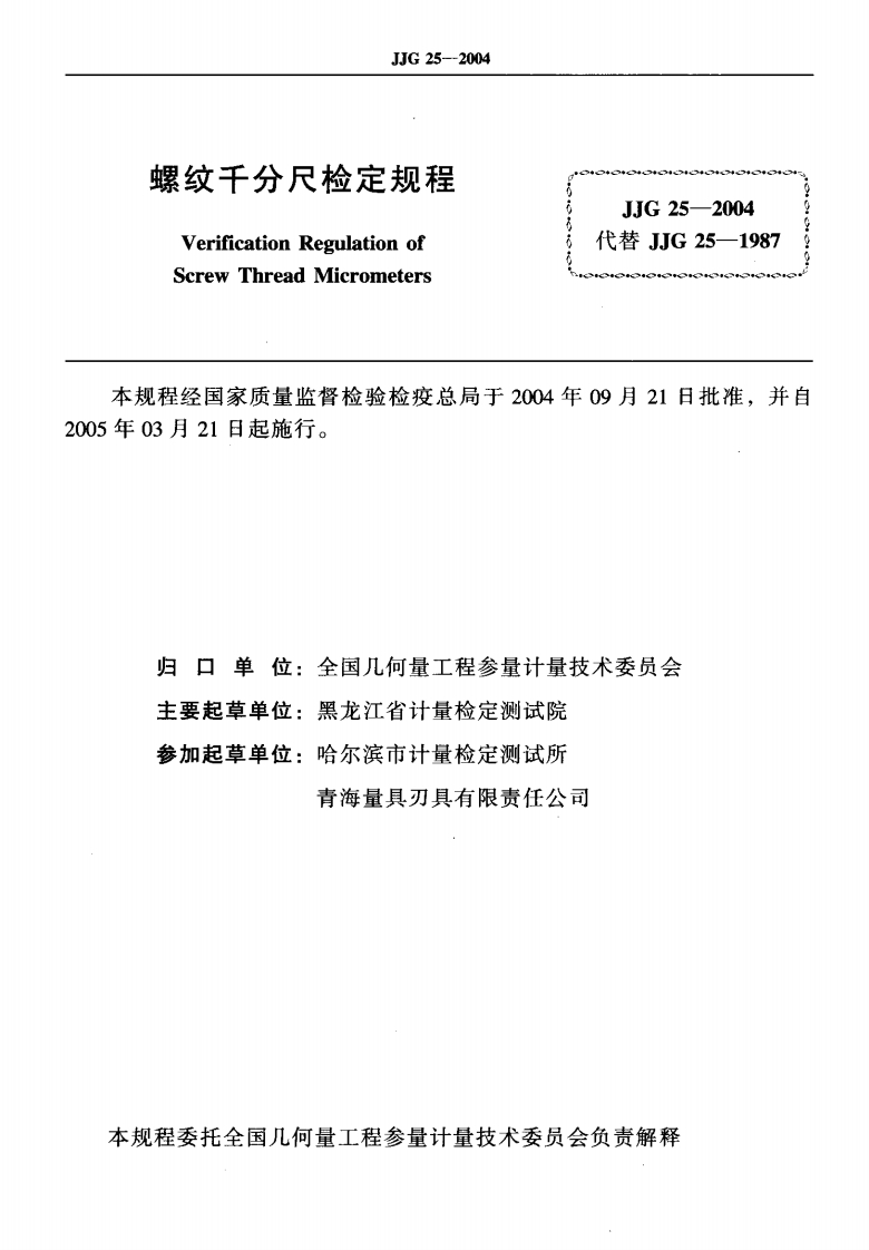 JJG25-2004螺纹千分尺348072@abc2个月前发布关注私信0.47MB21页04311JJG25-2004螺纹千分尺此内容为付费资源,请付费后查看¥16¥23黄金会员免费钻石会员免费立即购买您当前未登录!建议登陆后购买,可保存购买订单付费资源 第1页 / 共21页 第2页 / 共21页 试读已结束,还剩19页,您可下载完整版后进行离线阅读 © 版权声明文章版权归作者所有,未经允许请勿转载。THE END标准规范 文本预览 刘可g中华人民共和国国家计量检定规程JJG25一2004螺纹千分尺Screw Thread Micrometers2004-09-21发布2005-03-21实施国家质量监督检验检疫总局发布 查看更多 收起部分 喜欢就支持一下吧点赞11 分享QQ空间微博QQ好友海报分享复制链接收藏