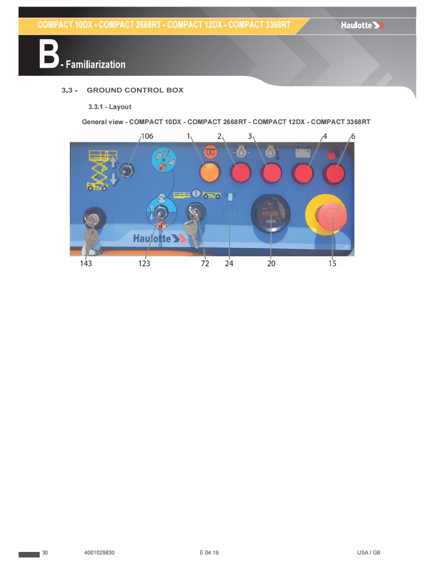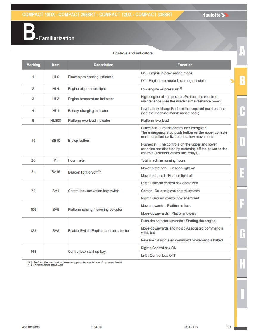 COMPACT 10DX-COMPACT 2668RT-COMPACT 12DX-COMPACT 3368RTHaulotteBFamiliarizationMaintenance operation-The stand located under one of the scissor arms must be setup:For COMPACT 10DX -COMPACT 2668RT:Lift scissor arms to a sufficient height(floor of theplatform at around 2,6 m/8 ft 6 in from the ground).For COMPACT 12DX-COMPACT 3368RT:Lift scissor arms to a sufficient height(floor of theplatform at around 3,1 m/10 ft 2 in from the ground).Unscrew,rotate and put the stand in the vertical position.The stand should remain in the vertical position.Lower the scissor arms.Scissor arm pivoting rod should rest on the V groove of the stand.At the end of the maintenance operationLift scissor arms to a sufficient height to tilt the stand..Free the V of the stand from the scissor pin.Attach the stand on the scissor arm.EH4001029830E04.19USA/GB29
