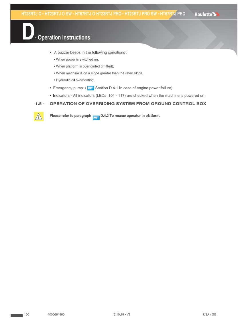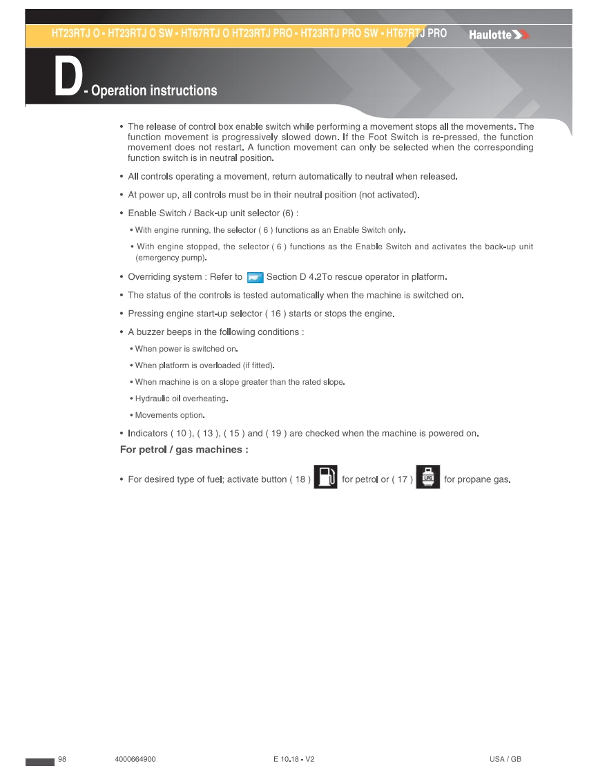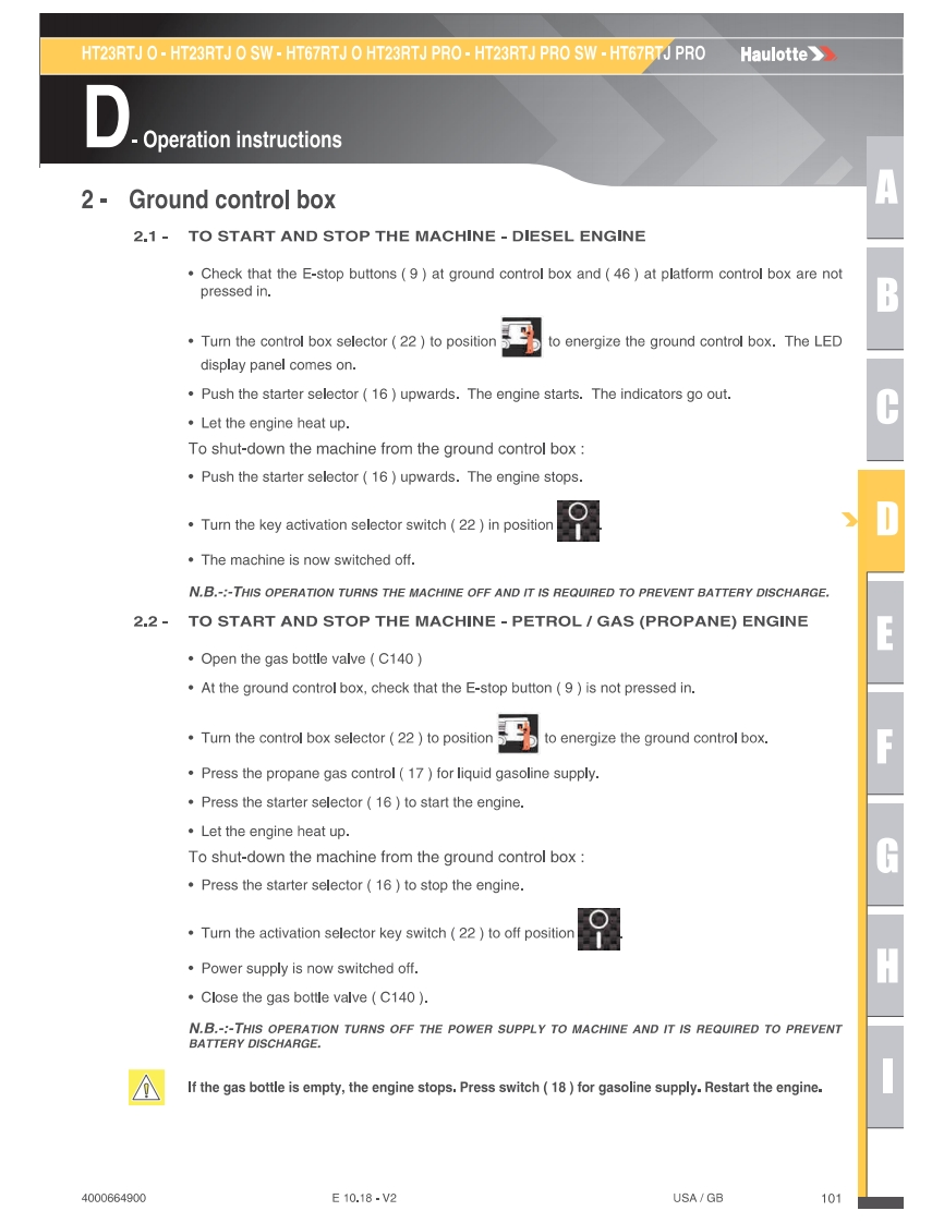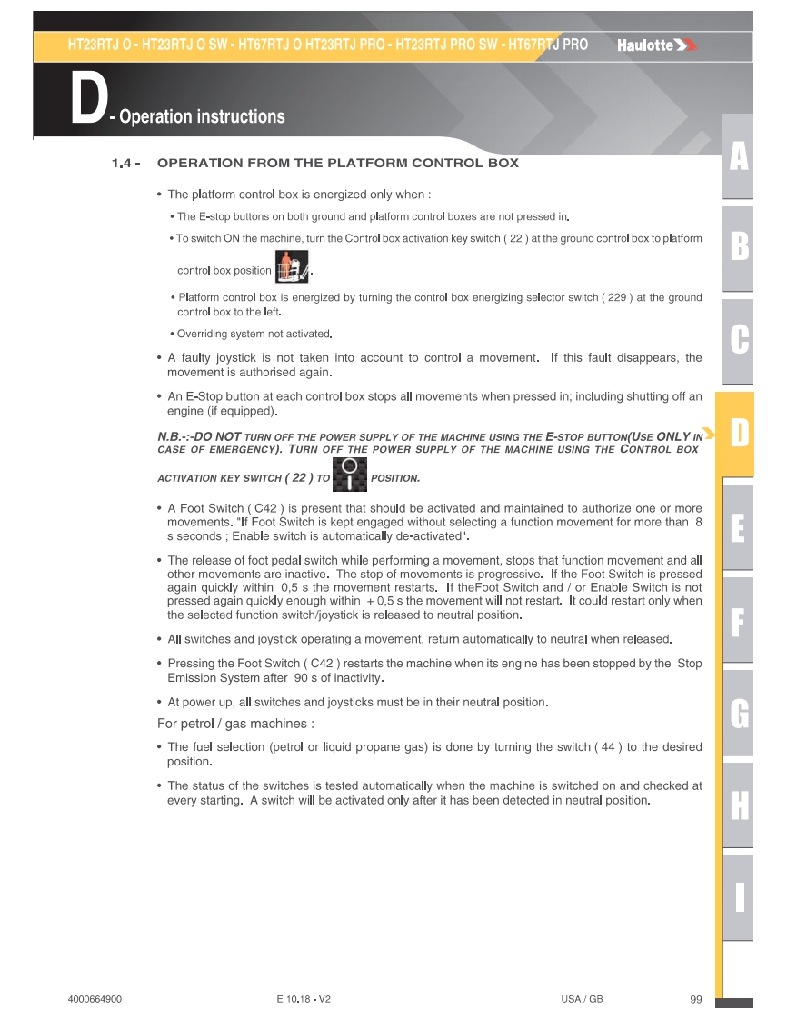 HT23RTJ O-HT23RTJ O SW-HT67RTJ O HT23RTJ PRO-HT23RTJ PRO SW HT67RTJ PROHaulotte>》Operation instructions1-Operation1.1-INTRODUCTIONOnly trained and authorized personnel shall be permitted to operate this aerial work platform.Prior to operationRead,understand and obey all instructions and safety precautions in this manual and attached to theaerial work platform.Read,understand and obey all Federal,State and local codes and regulations.Become familiar with the proper use of all controls and emergency systems.1.2-MAJOR DESCRIPTIONAll the machines are equipped withPlatform control box.Ground control box (Auxiliary power and overriding system).Stop Emission System.1.3-OPERATION FROM THE GROUND CONTROL BOXThe ground control box is designed for maintenance and emergency rescue operations only.Turning ON/OFF is performed with engine start-up selector(16)after the control box activation keyswitch 22 is tumned to the ground control box position.Activation of a desired control box is achieved by turning the Control box activation key switch(22to the desired positionThe ground control box is energized and is active ONLY whenThe E-stop buttons on both ground and platform control boxes are not pressed in(Deactivated).To switch ON the machine,turn the Control box activation key switch 22 at the ground control box on groundcontrol box positionAn E-Stop button at each control box stops all movements when pressed in;including shutting off anengine (if equipped).N.B.-:-DO NOT TURN OFF THE POWER SUPPLY OF THE MACHINE USING THE E-STOP BUTTON(USE ONLY INCASE OF EMERGENCY).TURN OFF THE POWER SUPPLY OF THE MACHINE USING THE CONTROL BOXACTIVATION KEY SWITCH 22 TOPOSITION.An Enable /Foot Switch(6 )is present that should be activated and maintained to authorize one ormore movements."If Enable Switch(6)is kept engaged without selecting a function movement formore than 8 seconds;Enable Wwitch is automatically de-activated".4000664900E10.18-V2USA/GB97