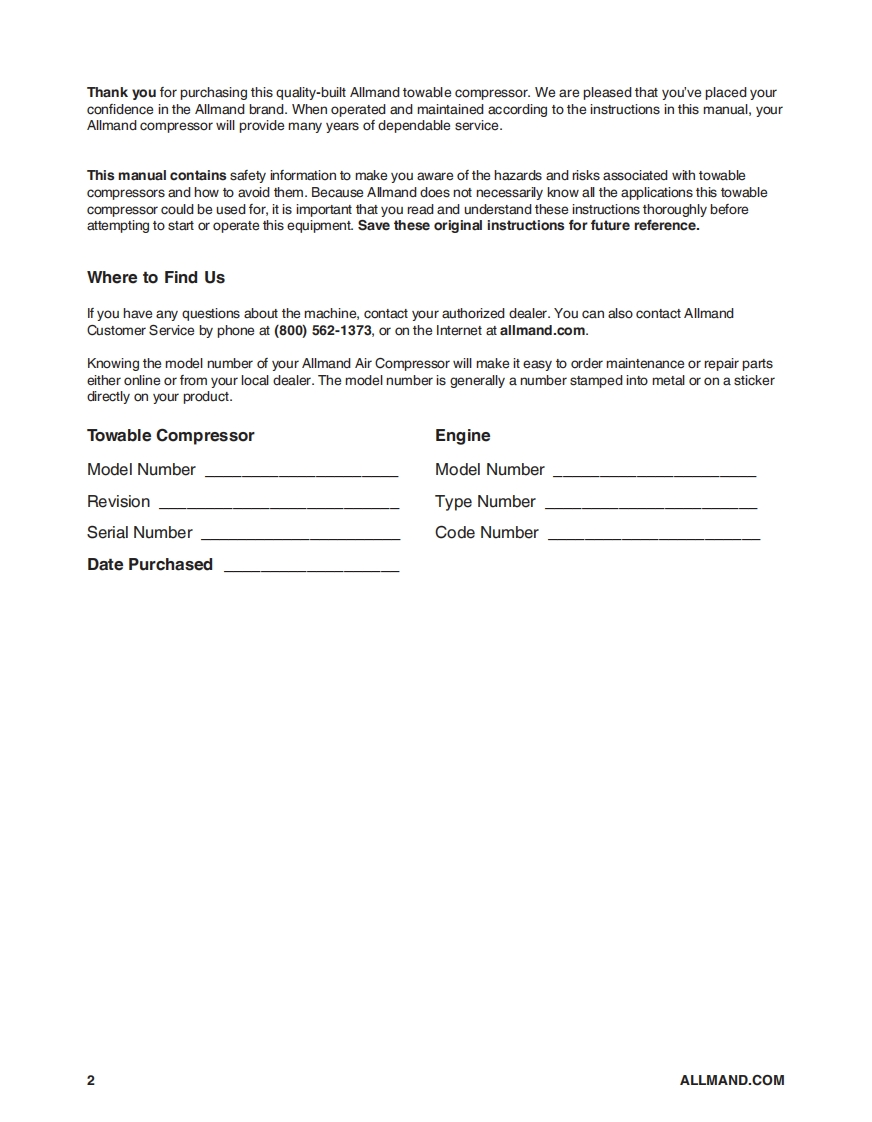 Maxi-Air-185-Operators-Manual-2018-111075-Rev-D操作与维护手册348072@abc16小时前发布关注私信12.94MB64页037Maxi-Air-185-Operators-Manual-2018-111075-Rev-D操作与维护手册此内容为付费资源,请付费后查看¥39¥49黄金会员免费钻石会员免费立即购买您当前未登录!建议登陆后购买,可保存购买订单付费资源 第1页 / 共64页 第2页 / 共64页 试读已结束,还剩62页,您可下载完整版后进行离线阅读 THE END工程机械 文本预览 AmandenOperator's ManualMaxi-AirTM Towable CompressorMA185(185CFM)m2@Copyright 2018 Allmand Bros.,Inc.111075USCNHoldrege,NE,USA.All rights reserved.Revision D 查看更多 收起部分 喜欢就支持一下吧收藏