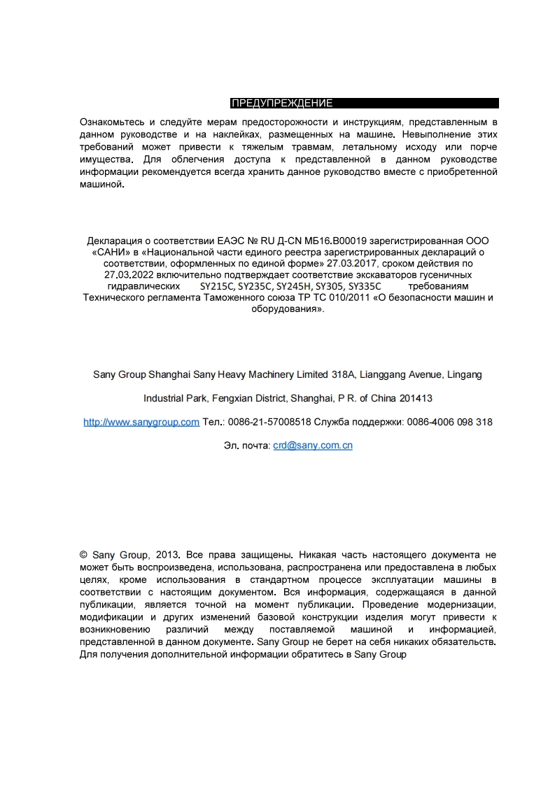 SANY上海三一重机股份有限公司SUITE A.NO.318 LIANGGANG ROAD LINGGANG INDUSTRIAL PARK SHANGHAI CITY CHINA.EACOKcKaBatop ryceHn4HbiN「vapaBnn4 ecknNSY215C SY235C/SY245HPyKOBOCTBO no 3KcnnyataunnTeXHNqeCKoMy oocnyKNBaHNHOSY215C/245.00.000P3Monenb 3KcKaBaTopa3aBonckon HoMepon N Mecay N3roToBneHNAynonHoMoyeHHoe Sany Group>uo B TaMoxeHHOM co3e:OOO CAHV>.Poccnnckaa enepauna,119421,r.MocKBa,JleHNHcKnn npocneKT,AoM 105,kopnyc 4.TenedoH/dpakc:+7 (499)502-28-26,e-mail:slash_3003@inbox.ru,vyacheslav.sanyrus@gmail.com.