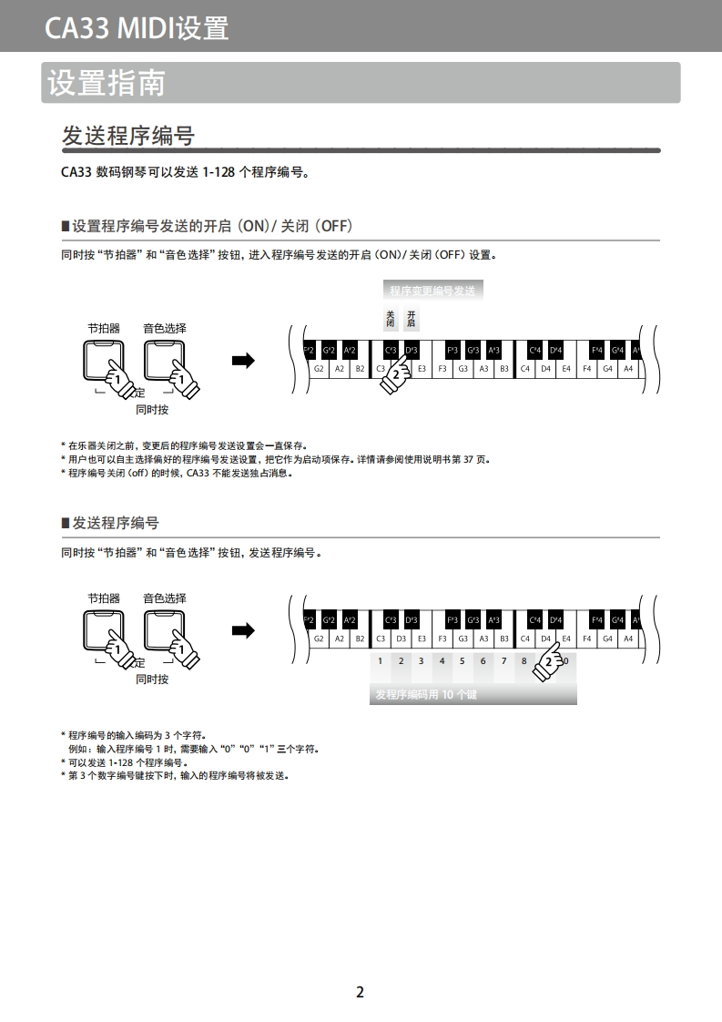 CA33MIDI设置关于MIDIMIDl是Musical Instrument Digital Interface(乐器数字接口)的缩写,一个国际标准,它可以使演奏信息在电子乐器,计算机和其它设备间交换。■MIDI接口的种类CA33数码钢琴的MDI接口分接收与传送两种。所有的信息交换都需要通过MIDI专用连接线来连接。MIDI接口名功能MIDIIN从连接MD1的乐器或音乐设备接收音符、音色等信息。MIDI OUT向连接MDI的乐器或音乐设备传送音符、音色等信息。■MIDI使用范例如图所示连接音序器,可以把CA33数码钢琴的演奏录制到音序器,录制的演奏乐曲也可以再次播放,有助于练习。把CA33数码钢琴设定为多音色时可以录制或播放多轨音,在同一通道同时播放钢琴、羽管键琴、颜音琴等多种音色的乐MIDI INMIDI OUTMIDI INMIDI OUT曲。音序器■CA33数码钢琴的MIDI功能发送和接收音符信息弹奏CA33数码钢琴,可以把音符信息传送到连接MIDI的乐器或音乐设备。反之,也可以把连接MID1的乐器或音乐设备上的音符信息传送到CA33数码钢琴。发送/接收程序(音色)编号弹奏CA33数码钢琴,可以更改连接MIDI的乐器或音乐设备的音色。反之,连接MIDI的乐器或音乐设备也可以更改CA33数码钢琴的音色。发送/接收踏板数据发送或接收延音踏板、保留音踏板、柔音踏板的开启/关闭等数据。接收音量数据弹奏连接MID的乐器或音乐设备,CA33数码钢琴发出声音时,可以通过MID1乐器或音乐设备调节CA33数码钢琴的音量。发送/接收通道设置规定发送或接收通道域值在1-16之间。多音色设置CA33数码钢琴作为接收乐器的时候,可以接收多通道的MID1数据,发出多种音色。发送/接收专用数据发送或接收作为专用数据的前面板操作或者设定模式变更设置。详情请参阅【MID1执行表】(第6页)。“MDI是音乐电子事业协会(AMEI)的注册商标。