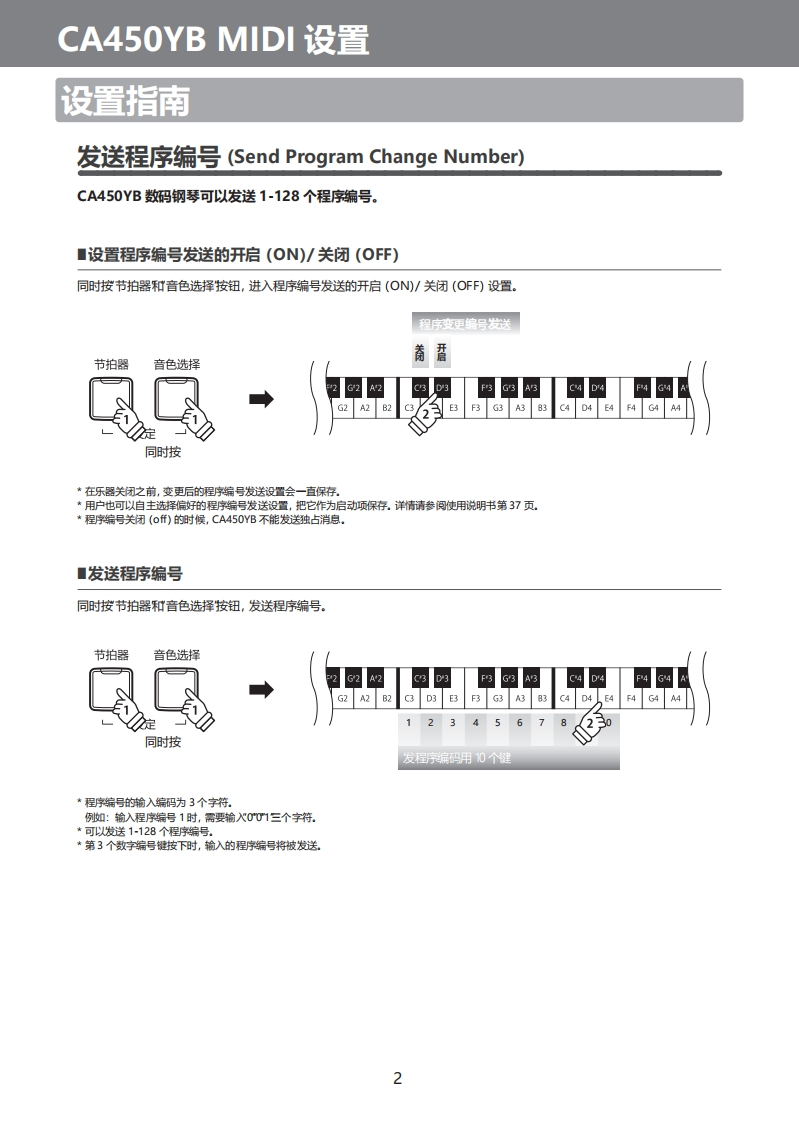 CA450 YB MIDI设置关于MIDIMIDl是Musical Instrument Digital Interface(乐器数字接口)的缩写,一个国际标准,它可以使演奏信息在电子乐器,计算机和其它设备间交换。IMID1使用案例当连接到电脑上时,利用运行在电脑上的音序器软件,数码钢琴即可用来录制和播放演奏。从而在数码钢琴上启用多音色模式,便可录制和播放多轨乐曲,在各MID1通道同时播放不同的声乐。号B插口A插口P4多音色模式(Muti-timbral Mode)■MIDI功能(MIDI functions)发送/接收音符信息发送/接收通道设置从连接MD1的乐器或音乐设备发送或接收音符信息。规定发送或接收通道域值在1至16之间。发送/接收程序变更编号多音色模式设置从连接MD1的乐器或音乐设备发送或接收程序变更编从连接MID1的乐器或音乐设备接收多通道MIDI数据。号。*多音色模式设置必须被开启。发送/接收踏板数据专用数据的发送/接收从连接MD1的乐器或音乐设备发送或接收延音踏板、保将面板操作和设置模式变更为专用数据时,可进行发送留音踏板和柔音踏板数据。与接收。接收音量数据接收从连接MIDI的乐器或音乐设备发送来的MIDI音量数据。板权声明基于现存作品(如CD、音乐文件、SMF数据等)的音乐片段只能用于私人聆听以及与朋友和家人一起欣赏。根据版权法,未经版权所有人许可,不准公开播放商用音乐,对数码钢琴用户的任何侵犯板权法的行为,K妇wai概不承担责任MlDI是音乐电子事业协会(AME)的注册商标.MIDI设置功能名称说明默认设置MIDI通道此设置是需要指定发送/接收通道的。所设定的通道将同时具备发送和接收功能。发1ch送和接收通道无法分开设置。发送程序变更编号此功能用于发送程序变更编号(值域1到128),以便改变外部M1D1设备的音色.本地控制此设置决定按琴键时数码钢琴是否播放内部声音。当使用数码钢琴控制外部M心!设On(开启)备时,此设置可以起到更好的帮助。当本地控制设为O(开启)时,数码钢琴将播放内部声音并将信息发送到外部MIDI设备。当本地控制设为O仟(关闭)时,数码钢琴只会将信息发送到外部MD1设备。发送程序变更编号的此设置决定当音色改变时,数码钢琴是否发送程序变更信息,On(开启)ON/OFF多音色模式此设置决定数码钢琴是否能同时接收多个MID1道上的MD1信总。这能允许乐器Of(关闭)播放从外部MD!设备发送的多轨、多音色演奏数据。通道静音仅当多音色模式开启时,才可启用此设置.此设置决定是否接收各MD通道的信息全部播放(ALL PLAY)1