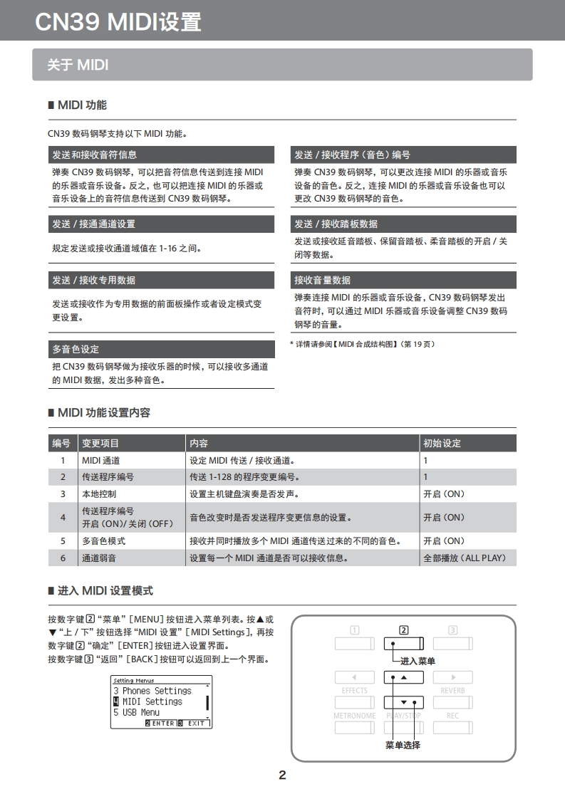 CN39MIDI设置关于MIDIMIDl是Musical Instrument Digital Interface(乐器数字接口)的缩写,一个国际标准,它可以使演奏信息在电子乐器,计算机和其它设备间交换。■MIDI接口的种类MDI接口名功能MIDIIN从连接MD1的乐器或音乐设备接收音符、音色等信息。MIDI OUT从连接MIDI的乐器或音乐设备传送音符、音色等信息。■MIDI通道MDI实际上指的是数据传输通道。数据传输通道包含接收和传送两种,一般带有MDI功能的乐器都有这两种通道。接收通道是指:一种乐器从其它乐器处接收数据时所使用的通道。传送通道是指:一种乐器给其它乐器传送数据时所使用的通道。例如:3台乐器按下图所示连接起来演奏。OUTNTHRU传送信息的乐器①接收信息的乐器②接收信息的乐器③传送乐器①是传送信息通道,把音符信息传送给接收信息的乐器②和③。接收信息的乐器②和③接收被从乐器①处传送的信息。通常来说,接收信息的乐器②和③的接收通道和传送信息的乐器①的传送通道一致时才能收到被传送的信息,否则不能接收。传送/接收信息的通道编号1-16都可以使用。■MIDI使用范例如图所示连接音序器,可以把CN39数码钢琴的演奏录制到音序器,录制的演奏乐曲也可以再次播放,有助于练习钢琴。把CN39数码钢琴设定为多音色时可以录制或播放多轨音,在同一通道同时播放钢琴、羽管键琴、颜音琴等多种音色的MIDI INMIDI OUTMIDI INMIDI OUT乐曲。音序器1