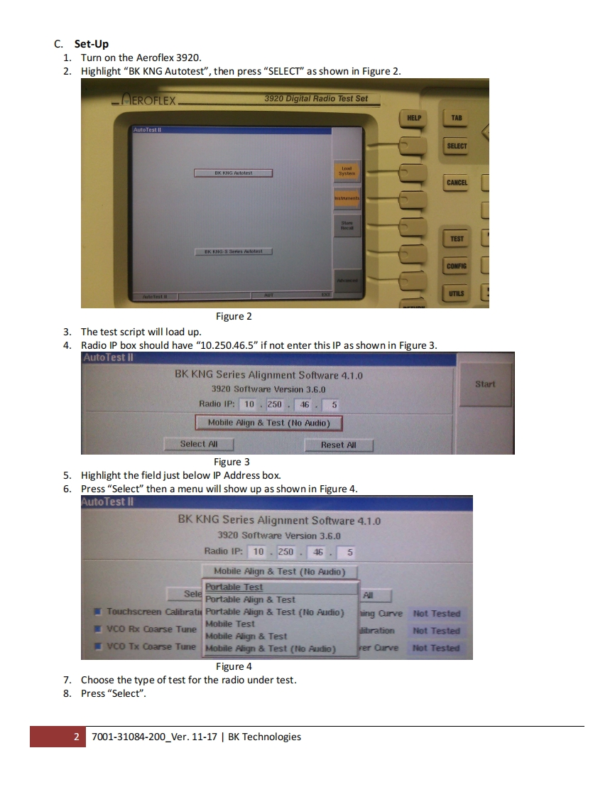 BKTECHNOLOGIESKAA0608AUser GuideA.GeneralThe KAA0608A is a cable assembly used for testing KNG-P/KNG-Ps series radios.This cable iscompatible with Cobham/Aeroflex 3920 only.If using HP8920,please use KAA0608.B.The KitRF Coax Cable-1ea.Double BananaPlug Adapter-1 ea.8e89Cable AssyBNC Male Binding Post-2 ea.7001-31084-200_Ver.11-17|BK Technologies