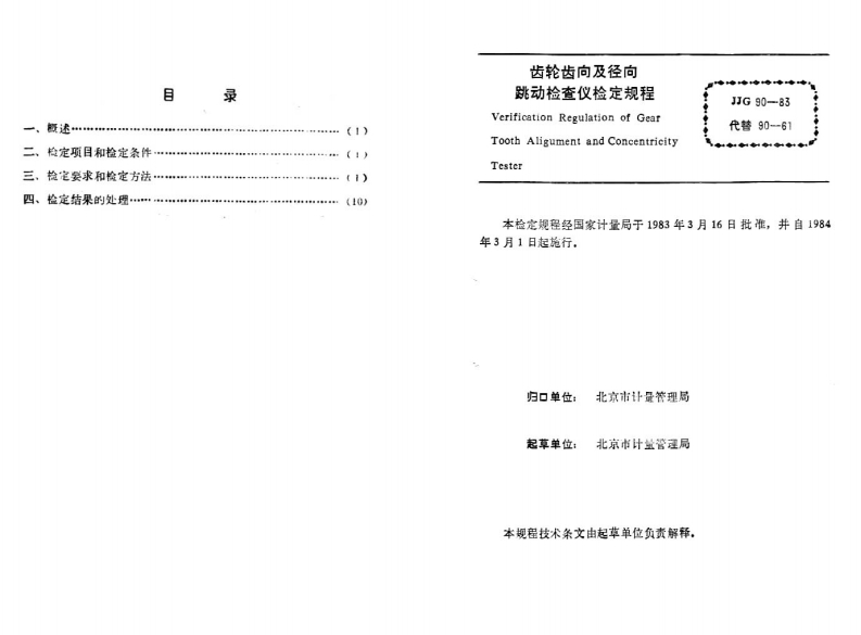 JJG90-1983齿轮齿向及径向跳动仪348072@abc4个月前发布关注私信1.08MB8页022JJG90-1983齿轮齿向及径向跳动仪此内容为付费资源,请付费后查看¥16¥23黄金会员免费钻石会员免费立即购买您当前未登录!建议登陆后购买,可保存购买订单付费资源 第1页 / 共8页 第2页 / 共8页 试读已结束,还剩6页,您可下载完整版后进行离线阅读 THE END标准规范 文本预览 中华人民共和国计量器具检定规程齿轮齿向及径向跳动检查仪JJG90-83齿轮齿向及经向味动检查攸检定规程JJG90-83因家计盘局轮有计组出数程出版4大起到甲利结3北京计盘白厂印司行华书店凳京发行所发行各地新培芳店经牌开本58g118角1九2乘3/小字数。平字印数1一11000184年4月闲一质1“4年4月第一水印司定价5,1元国家计量局利技录书日:71一:北京 查看更多 收起部分 喜欢就支持一下吧收藏
