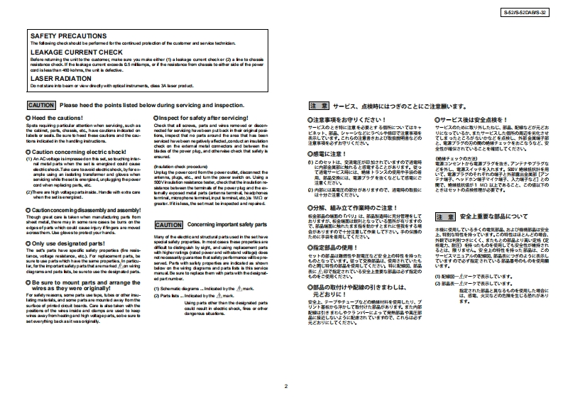 DENONVer.9Please refer to theMODIFICATION NOTICE.SERVICE MANUALMODELJPE3E2EKE2AE1CE1KEUTS-52S-52DABWIRELESS NETWORK CD MUSIC SYSTEMMODELJPE3E2EKE2AE1CE2KEUTS-32WIRELESS NETWORK MUSIC SYSTEM注意廿一七又在方乙春前忙、乙)少一上又又二1了儿卷必寸书蔬4〈龙志。本機:、火災、感電、付存忙对寸石安全性苍確保寸石左亿、志未艾未存配康态茄乙本一(茄)、夫左法的体「電气用品安全法」忙屯上老、所定)許可卷得(製造志九(茄)夫寸。徙一(片一上又卷茄乙存際体、乙九5)安全性雜持志九石太、乙)片一上又又二ュ了忙記載志九乙U石注意事項在必式方守)〈龙过。For purposes of improvement,specifications and·本機)仕横性能改良)龙协、予告在〈变更寸石乙上design are subject to change without notice.扬)李寸。·補修用性能部品)保有期間休、製造打切後8年C寸。.Please use this service manual with referring to the·修理)際:、必寸取极脱明害左参照)上、作業左行一operating instructions without fail.((龙t。.Some illustrations using in this service manual are·本文中忙使用L(L石亻与又卜体、脱明)都合上現物slightly different from the actual set.匕多少異在場合小方)李寸。DENONDenon Brand Company,D&M Holdings Inc.X0380V.09DE/CDM0906