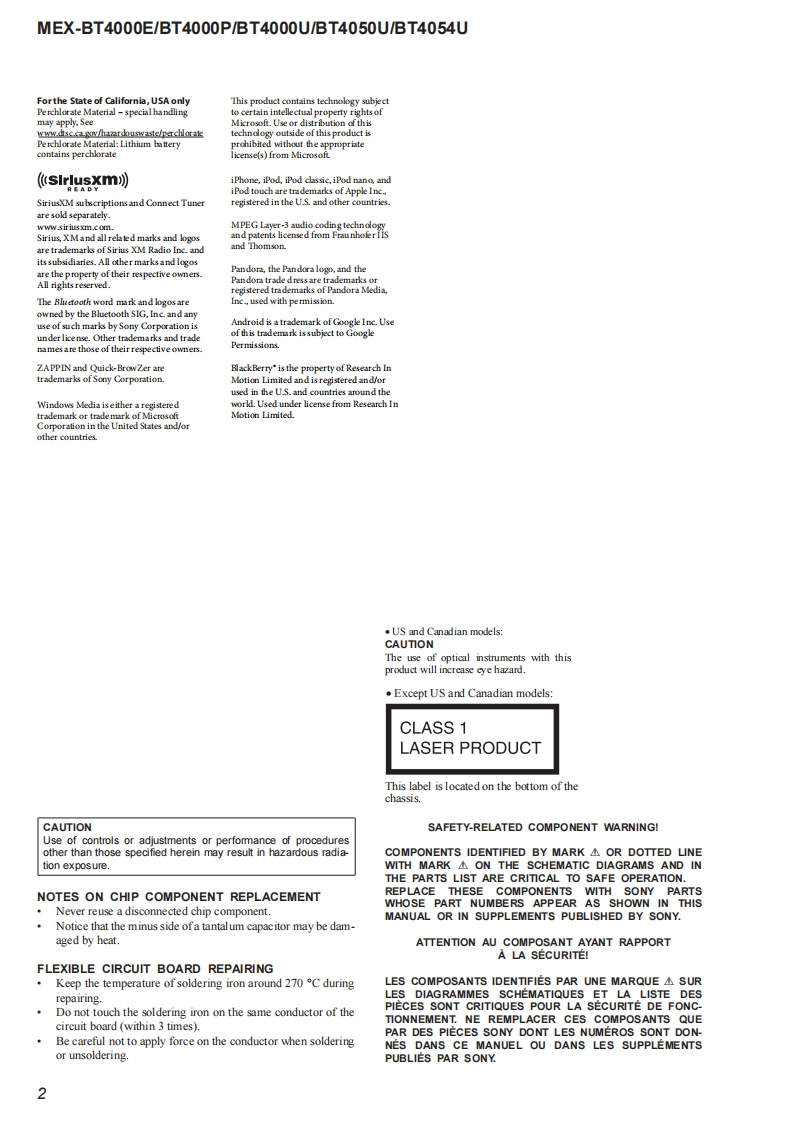 MEX-BT4000E/BT4000P/BT4000U/BT4050U/BT4054USERVICE MANUALUS ModelCanadian ModelVer.1.02011.11MEX-BT4000PAEP ModelUK ModelMEX-BT4000UE ModelMEX-BT4050URussian ModelMEX-BT4000EIndian ModelMEX-BT4054UPhoto:MEX-BT4000PThe Tuner and CD sections have no adjustments.Model Name Using Similar MechanismCDX-GT565UP/GT565UV/GT615UV/GT616UGMechanism TypeMG-101CA188Optical Pick-up NameDAX-25ASPECIFICATIONS(BT4050U:Saudi Abia model)M(AdoYdeae Cendheb)AUDIO POWER SPECIFICATIONSBT4000P9section (BT4000P)P6 am plifers的n1010-H)Tuner section(BT4050U:E Mexcan models/-5BT4054uCDPlayer sectionM-WirelessCommunicationa上.1+aM4Bluetooth'AUDIO SYSTEM9-893-368-012011K33-1Sony Corporation©2011.11SONYPublished by Sony Techno Create Corporation