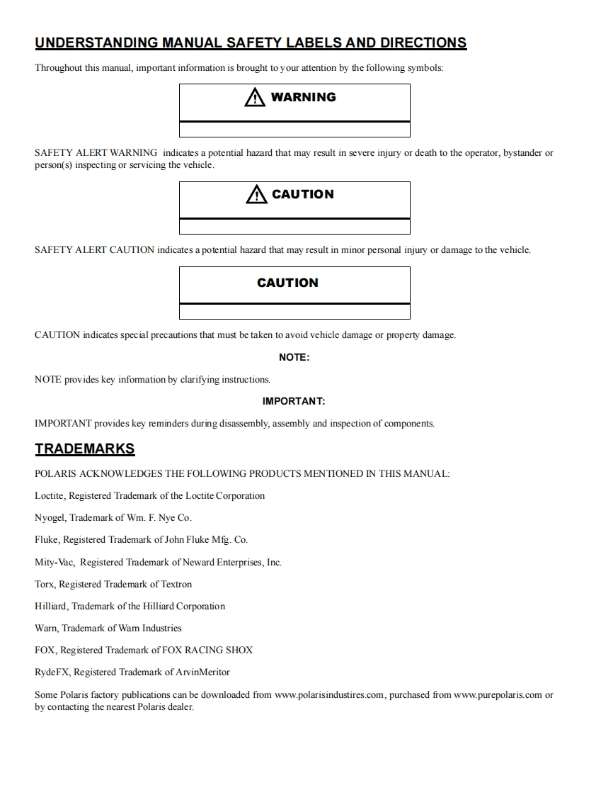 The Way Out.UNDERSTAND THE RIDING EXFERIENGE.LivE THe RiDiNG ExpERiENcE.WoRk TO MAKE IT BetTeRPE原2008 RANGER RZRSERVICE MANUALFOREWORDThis service manual is designed primarily for use by certified Polaris Master Service Dealer technicians in a properlyequipped shop and should be kept available for reference.All references to left and right side of the vehicle are fromthe operator's perspective when seated in a normal riding position.Some procedures outlined in this manual require a sound knowledge of mechanical theory,tool use,and shopprocedures in order to perfom the work safely and correctly.Technicians should read the text and be familiar withservice procedures before starting the work.Certain procedures require the use of special tools.Use only the propertools as specified.Comments or suggestions about this manual may be directed to:Service Publications Dept.@Polaris Sales Inc.2100 Hwy 55 Medina Minnesota 55340.2008 Service Manual PN 9921278Copyright 2007 Polaris Sales Inc.All information contained within this publication is based on the latest product information at the fime of publication.Due to constantimprovements in the design and quality of production components,some minor discrepancies may result between the actual vehicle and the information presented in thispublication.Depictions and/or procedures in this publication are intended for reference use only.No liability can be accepted for omissions or inaccuracies.Anyreprinting or reuse of the depictions and/or procedures contained within,whether whole or in part,is expressly prohibited.Printed in U.S.A.