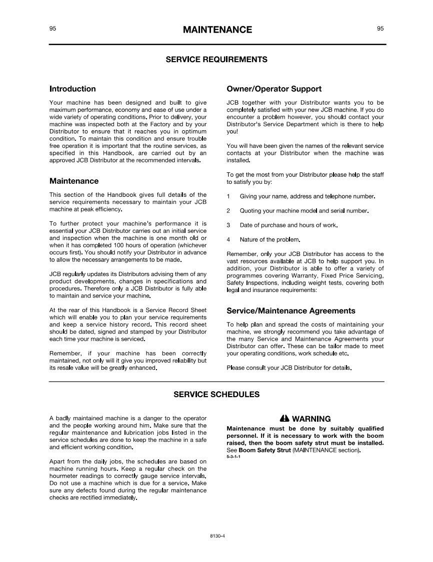 MAINTENANCE94LUBRICANTS HEALTH AND SAFETYIt is most important that you read and understand thisinformation and the publications referred to.Make sure allyour colleagues who are concerned with lubricants read ittoo.HygieneJCB lubricants are not a health risk when used properly2Apply a barrier cream to the skin before handlingfor their intended purposes.used engine oil.However,excessive or prolonged skin contact can removeNote the following when removing engine oil fromthe natural fats from your skin,causing dryness andskin:irritation.a Wash your skin thoroughly with soap and water.Low viscosity oils are more likely to do this,so takespecial care when handling used oils,which might beb Using a nail brush will help.diluted with fuel contamination.c Use special hand cleansers to help clean dirtyWhenever you are handling oil products you shouldhands.maintain good standards of care and personal and planthygiene.For details of these precautions we advise you tod Never use petrol,diesel fuel,or paraffin forread the relevant publications issued by your local healthwashing.authority,plus the following.e Avoid skin contact with oil soaked clothing.Storagef Don't keep oily rags in pockets.Always keep lubricants out of the reach of children.g Wash dirty clothing before re-use.Never store lubricants in open or unlabelled containers.h Throw away oil-soaked shoes.Waste DisposalFirst Aid -OilAll waste products should be disposed of in accordancewith all the relevant regulations.EyesIn the case of eye contact,flush with water for 15 minutes.The collection and disposal of used engine oil should be inIf irritation persists,get medical attention.accordance with any local regulations.Never pour usedengine oil into sewers,drains or on the ground.SwallowingIf oil is swallowed do not induce vomiting.Get medicalHandlingadvice.SkinNew OilIn the case of excessive skin contact,wash with soap andwater.There are no special precautions needed for the handlingor use of new oil,beside the normal care and hygienepractices.SpillageUsed OilAbsorb on sand or a locally approved brand of absorbentgranules.Scrape up and remove to a chemical disposalUsed engine crankcase lubricants contain harmfularea.contaminants.FiresHere are precautions to protect your health when handlingused engine oil:Extinguish with carbon dioxide,dry chemical or foamextinguishers.Do not use water.Fire-fighters should use1 Avoid prolonged,excessive or repeated skin contactself-contained breathing apparatus.with used engine oils.8130-2