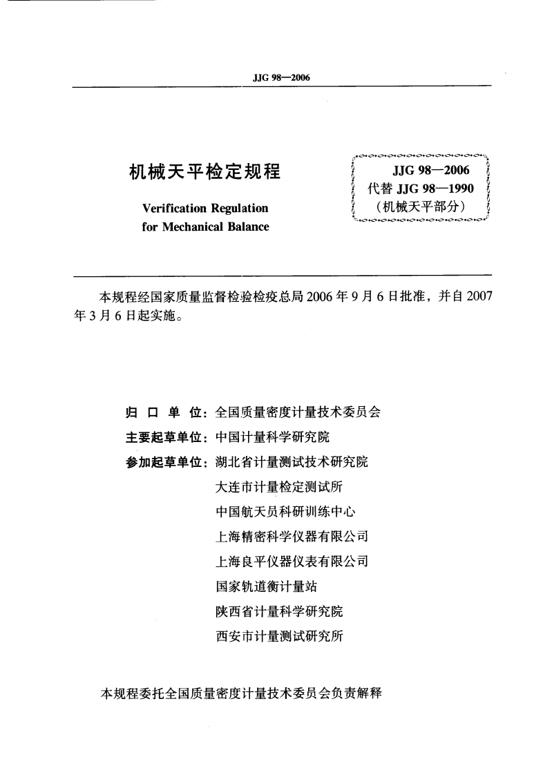 JJG98-2006机械天平348072@abc4个月前发布关注私信0.80MB28页030JJG98-2006机械天平此内容为付费资源,请付费后查看¥16¥23黄金会员免费钻石会员免费立即购买您当前未登录!建议登陆后购买,可保存购买订单付费资源 第1页 / 共28页 第2页 / 共28页 试读已结束,还剩26页,您可下载完整版后进行离线阅读 THE END标准规范 文本预览 可G中华人民共和国国家计量检定规程JJG98-2006机械天平Mechanical Balance2006-09-06发布2007-03-06实施国家质量监督检验检疫总局发布 查看更多 收起部分 喜欢就支持一下吧收藏