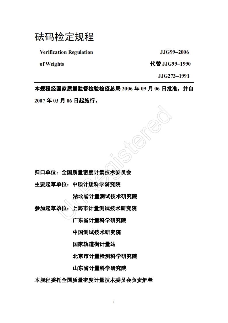 JJG99-2006砝码348072@abc4个月前发布关注私信0.68MB57页042JJG99-2006砝码此内容为付费资源,请付费后查看¥16¥23黄金会员免费钻石会员免费立即购买您当前未登录!建议登陆后购买,可保存购买订单付费资源 第1页 / 共57页 第2页 / 共57页 试读已结束,还剩55页,您可下载完整版后进行离线阅读 THE END标准规范 文本预览 JJG中华人民共和国国家计量检定规程JJG99-2006砝码UnRegisteredWeights2006-09-06发布2007-03-06实施国家质量监督检验检疫总局发布 查看更多 收起部分 喜欢就支持一下吧收藏