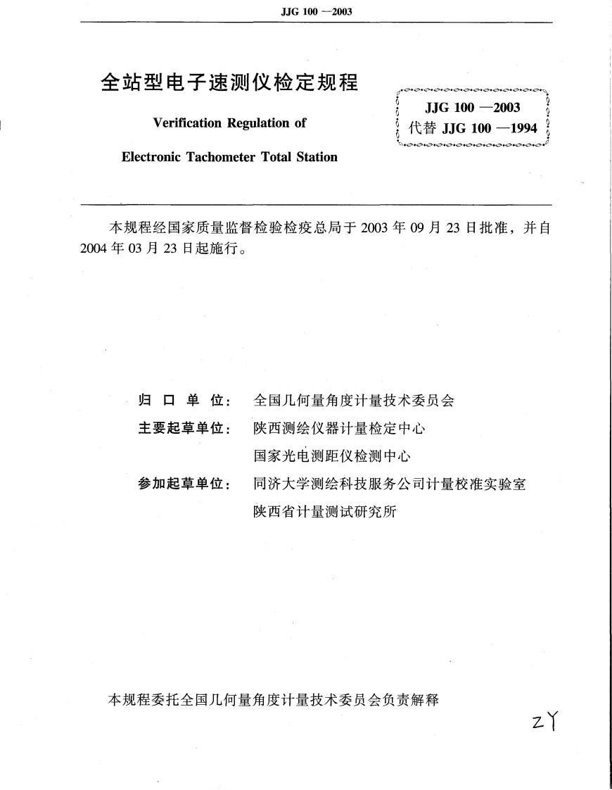 JJG100-2003全站型电子测速仪检定规程348072@abc4个月前发布关注私信1.17MB33页044JJG100-2003全站型电子测速仪检定规程此内容为付费资源,请付费后查看¥16¥23黄金会员免费钻石会员免费立即购买您当前未登录!建议登陆后购买,可保存购买订单付费资源 第1页 / 共33页 第2页 / 共33页 试读已结束,还剩31页,您可下载完整版后进行离线阅读 THE END标准规范 文本预览 可可G中华人民共和国国家计量检定规程JJG100一2003全站型电子速测仪Electronic Tachometer Total Station2003-09-23发布2004-03-23实施国家质量监督检验检疫总局发布 查看更多 收起部分 喜欢就支持一下吧收藏