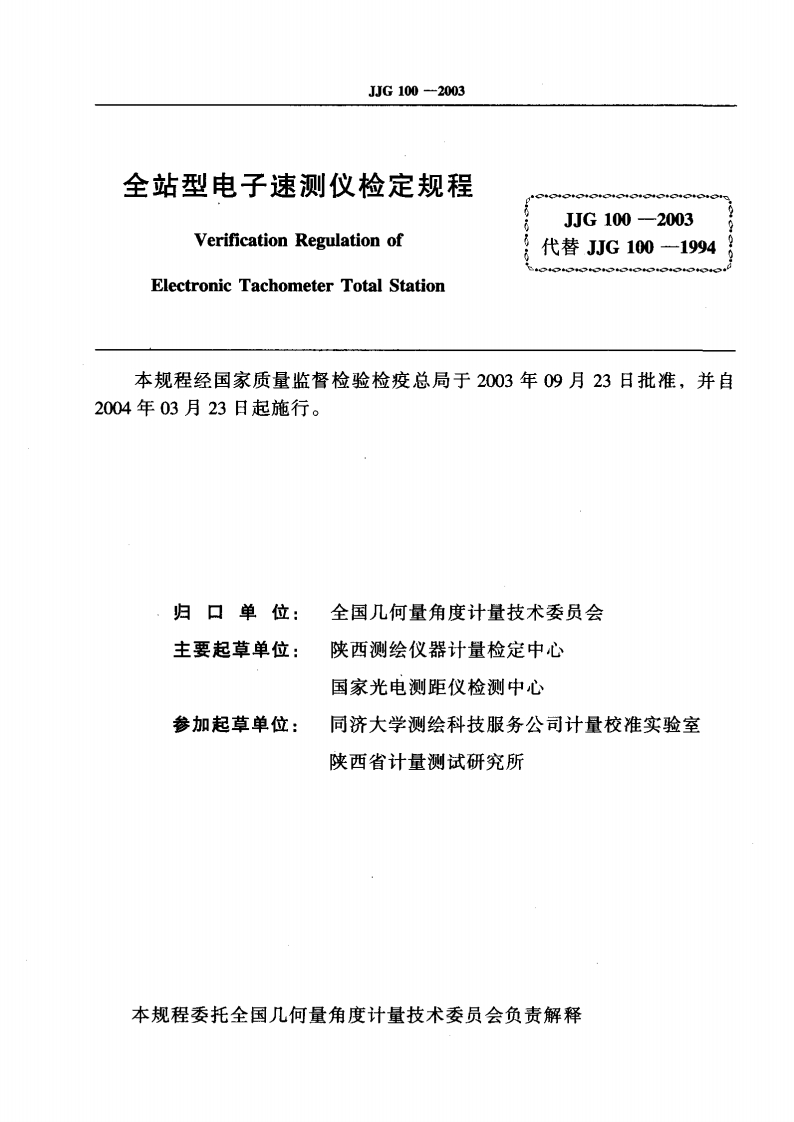 JJG100-2003全站型电子速测仪348072@abc4个月前发布关注私信0.83MB32页035JJG100-2003全站型电子速测仪此内容为付费资源,请付费后查看¥16¥23黄金会员免费钻石会员免费立即购买您当前未登录!建议登陆后购买,可保存购买订单付费资源 第1页 / 共32页 第2页 / 共32页 试读已结束,还剩30页,您可下载完整版后进行离线阅读 THE END标准规范 文本预览 可可G中华人民共和国国家计量检定规程JJG100-2003全站型电子速测仪Electronic Tachometer Total Station2003-09-23发布2004-03-23实施国家质量监督检验检疫总局发布 查看更多 收起部分 喜欢就支持一下吧收藏