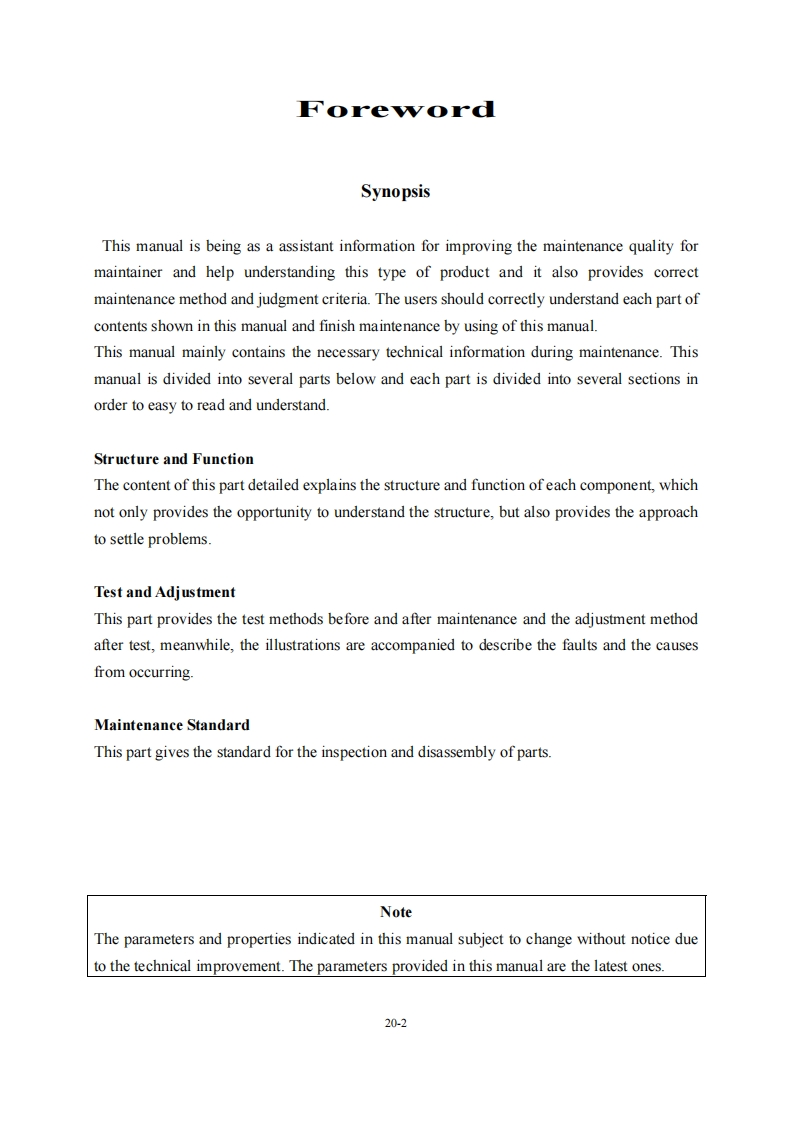 Installation and Maintenance ManualForeword20-2Safety Notes--20-4Description of Hanging Up20-6Tightening Torque----20-8EngineSpecification and Maintenance20-9Transmission System1.Structure and Function20-192.Maintenance Standard-20-49Steering System1.Structure and Function20-522.Test and Adjustment--20-683.Maintenance Standard20-74Braking System1.Structure and Function--20-782.Test and Adjustment-20-863.Maintenance Standard--20-92Hydraulic System1.Structure and Function20-952.Test and Adjustment-20-1153.Maintenance Standard20-118Work Equipment1.Structure and Function--20-1202.Test and Adjustment-20-1283.Maintenance Standard-20-138Electric System--20-14520-1