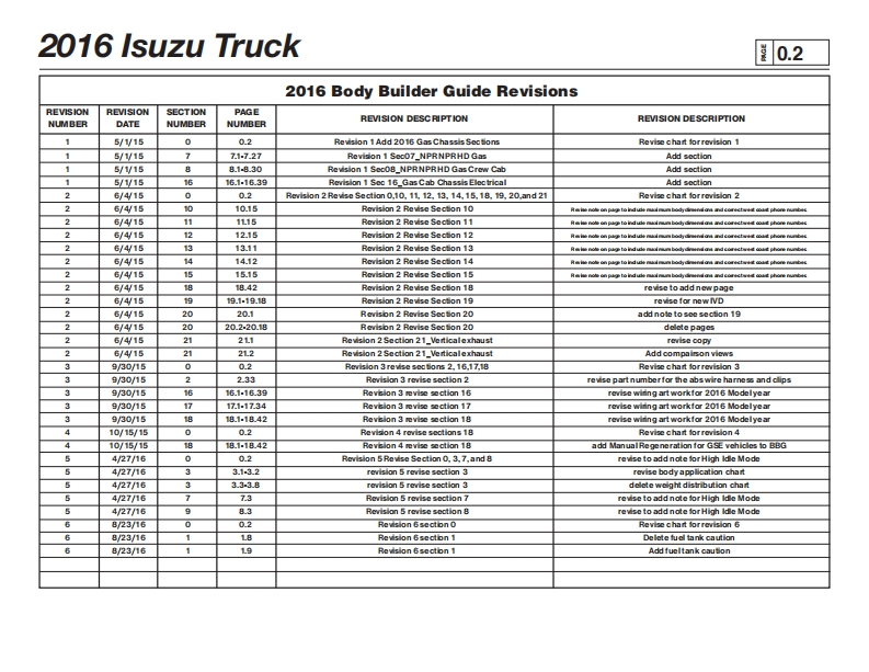 2016 Isuzu Truck0.1Figure 0.1.1Attention Body Builders!Isuzu N-Series Body Builder guides are now available for FREE!-go to:www.isuzutruckservice.comDownloadlsuzu's Body Builder Guide or sections for important information about up fitting your N-Series Medium Duty Commercialtruck.Please check SectionO to review information that has changed since your last visit as the guide is updated from time to time to include the latest information available.All printed mate-rial,specifcations,and drawingscontained in the lsuzu's Body Builder Guide are based on the latest information available at the time of publication /posting.Themanufacturer reserves the right to discontinue or change,at any time,without notice specifications,options,materials,equipment,design and models.Information contained in the guide includes:FMVSS safety standardEPA requirementsOE recommendationsCautions for successful application up fitting and Frame modifcation proceduresLast updated on 'date"