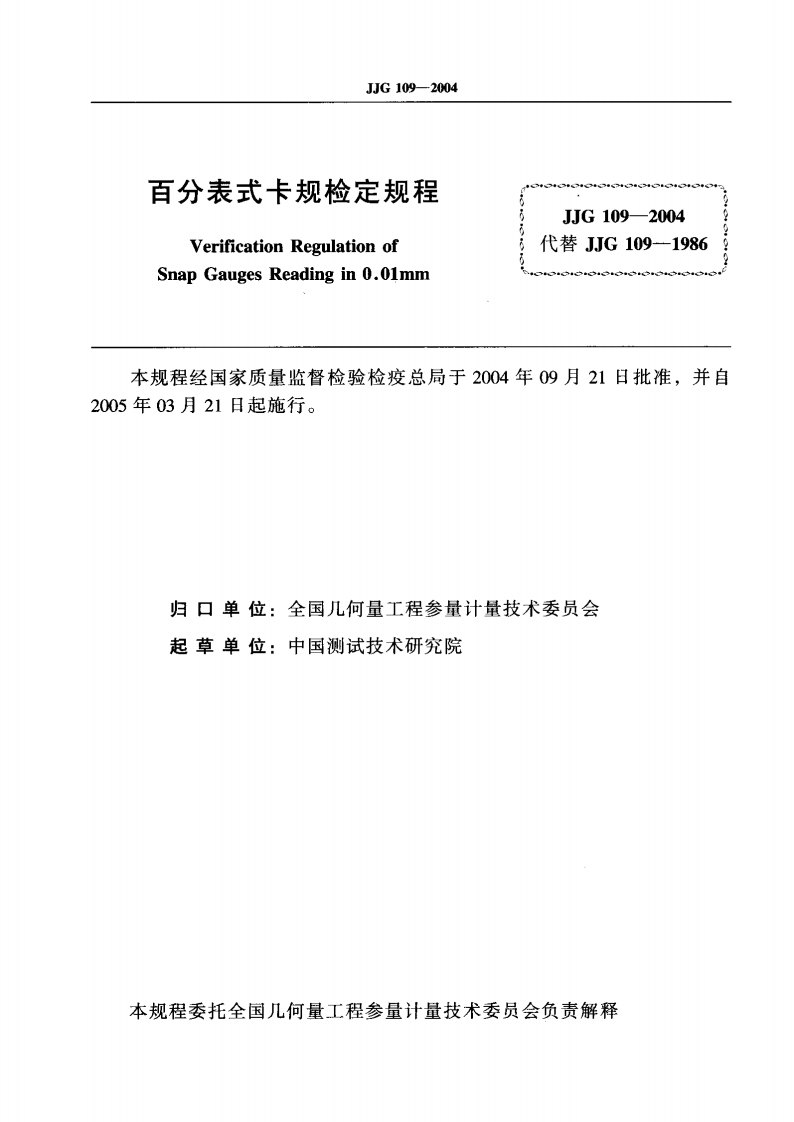 JJG109-2004百分表式卡规348072@abc4个月前发布关注私信0.23MB12页025JJG109-2004百分表式卡规此内容为付费资源,请付费后查看¥16¥23黄金会员免费钻石会员免费立即购买您当前未登录!建议登陆后购买,可保存购买订单付费资源 第1页 / 共12页 第2页 / 共12页 试读已结束,还剩10页,您可下载完整版后进行离线阅读 THE END标准规范 文本预览 可G中华人民共和国国家计量检定规程JJG109-2004百分表式卡规Snap Gauges Reading in 0.01mm2004-09-21发布2005-03-21实施国家质量监督检验检疫总局发布 查看更多 收起部分 喜欢就支持一下吧收藏