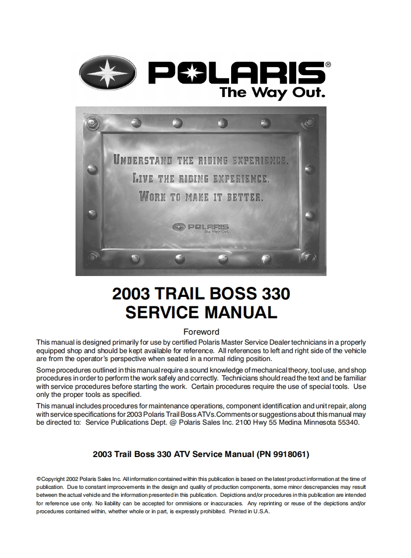 polaris-trail-boss-service-manual维修维护手册348072@abc昨天发布关注私信23.16MB71页046polaris-trail-boss-service-manual维修维护手册此内容为付费资源,请付费后查看¥29¥39黄金会员免费钻石会员免费立即购买您当前未登录!建议登陆后购买,可保存购买订单付费资源 第1页 / 共71页 第2页 / 共71页 试读已结束,还剩69页,您可下载完整版后进行离线阅读 THE END工程机械 文本预览 米POLARIS2003 TRAIL BOSS SERVICE MA NUAL PN 99180512003 TRAIL BOSSSERVICE MANUALPN891806100009Printed in USA 查看更多 收起部分 喜欢就支持一下吧收藏