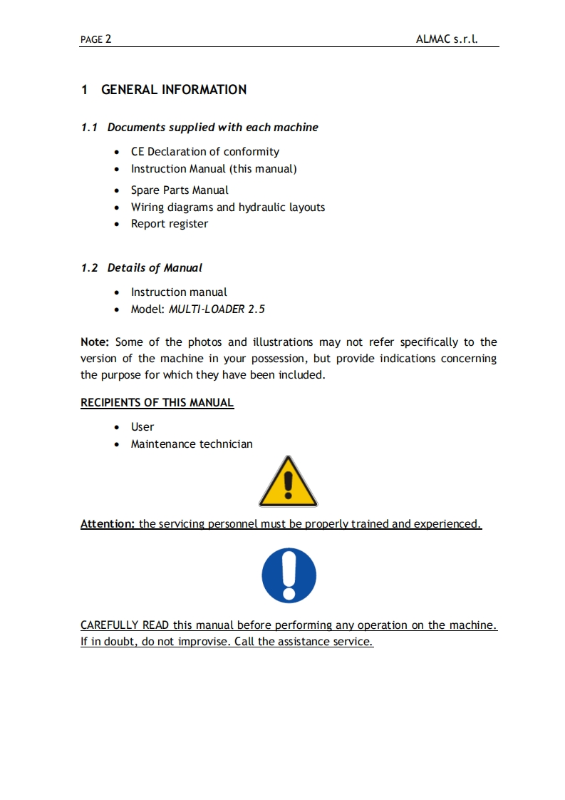 次ALMACRAWLERMULTI-LOADER 2.5MULTI-LOADER 2.5Translation of original instructionsPrior to commissioning the machine carefully read this Use andMaintenance ManualNote:table of contents at the end of the manualEditionDate0022/03/2017
