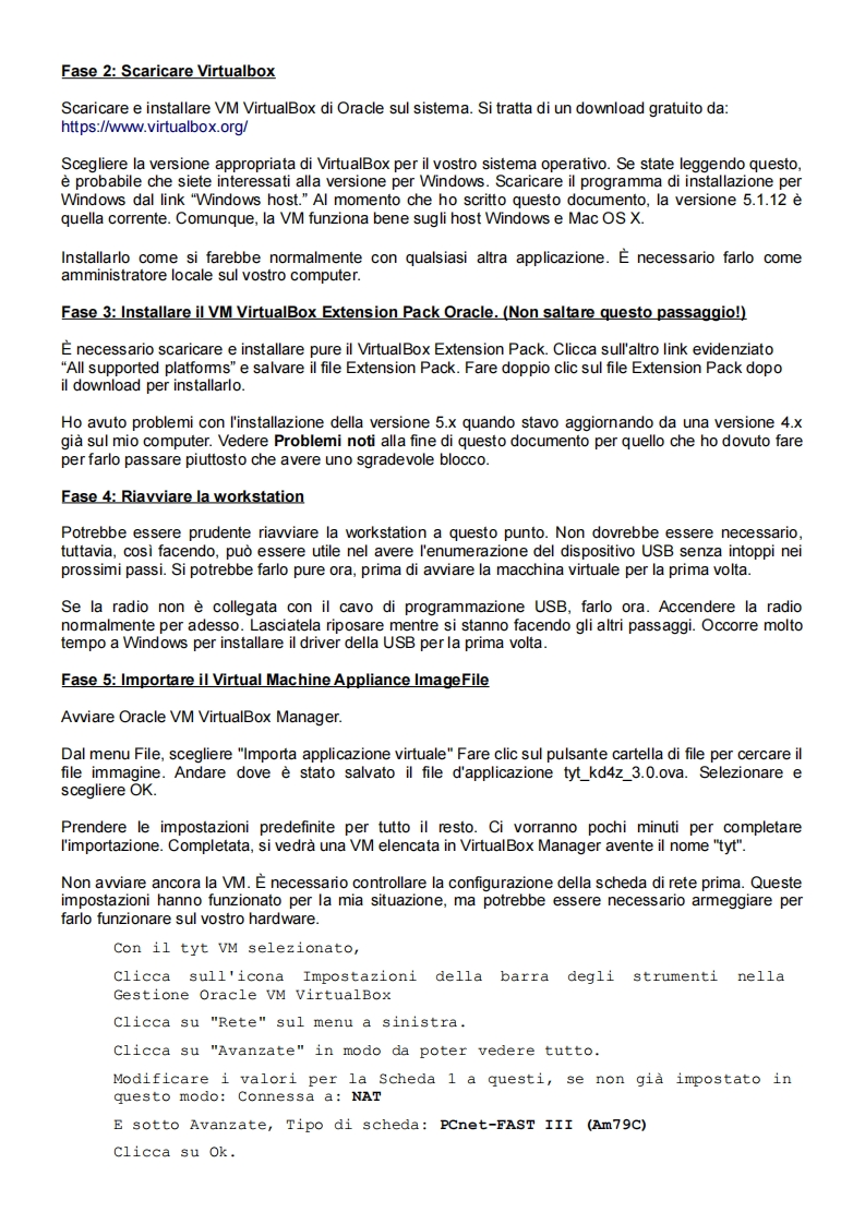 Aggiornare i MD-380/Retevis RT3 oMD-390 con GPS/Retevis RT8 con GPS daWindows utilizzando una Virtual Machine LinuxWarren Merkel,KD4Zversione 3.08(traduzione di Roberto Rizzardi IU5FHF)La versione piu recente di questo documento e file di immagine VM da github a questo link:https://github.com/KD4Z/md380tools-vmQuesto progetto e una derivazione da kdokkv-vm.I ringraziamenti vanno a KDOKKV per aver rilasciatola prima immagine VirtualBox,che ha suscitato il mio interesse a fare aggiornamenti in Windows,inprimo luogo.Sembra che Travis Goodspeed e amici stiano attualmente creando i files binari di Windows,in modo che I'utilita di questa Virtual Machine (VM)possa essere ridotta nel prossimo futuro.Per ora,questa VM consente di utilizzare MD380tools per mantenere la radio aggiornata utilizzando unsistema basato su Windows invece di una macchina Linux o Raspberry Pi.In realta,per fare questo,visara l'esecuzione di una Virtual Machine Linux.Questa VM funziona bene su computer portatili Windows7,Windows 10 o Mac OS X,il che la rende altamente mobile.Se installato su un computer portatile,epossibile eseguire un comando mentre si e in linea con Internet,quindi scollegare e andare alle riunionidi club o altre funzioni e le radio in flash senza la necessita di un affidabile connessione internet.Mi e stato chiesto piu e piu volte,Come faccio a fare questo con Windows e cosi ecco qui.Ho creatoquesta derivazione per migliorare l'immagine di supporto alla radio MD-390 con GPS e fornire piudettagliate istruzioni nel suo utilizzo.Cio aggiunge anche un po'di roba complessa per rendere la vostravita molto piu facile.Fase 1:Scaricare il file immagine contenente la VMAvrete bisogno di scaricare un file che contiene I'immagine Virtual Machine.Con il vostro browser preferito andate a:https://github.com/KD4Z/md380tools-vmGli attuali link per il download saranno elencati su quel sito.Attualmente ci sono due immagini diversedisponibili.Uno e per I'utilizzo con il software VirtualBox VM.L'altro e per I'uso con VMWare Fusion.Lecaratteristiche di VM sono le stesse,quindi se si ha familiarita con uno piu dell'altro,andare con quello!Questo documento e stato scritto principalmente con esempi di VirtualBox.Tuttavia,se si va conVMWare.i concetti sono identici.Nota:Potrebbe essere necessario fare clic destro sul link e scegliere "Salva collegamentocome ..Vogliamo scaricarlo come un file,non visualizzarlo sullo schermo.Questo dovrebbeevitare il download che visualizza un problema che alcuni utenti hanno segnalato.ll file OVA ecompresso con Zip.L'immagine e disponibile anche in quattro parti,archiviate utilizzandoI'applicazione 7-zip.Avrete bisogno di 7-Zip per estrarre il file OVA.E possibile scaricare questoeccellente programma di utilita gratuito qui http://www.7-zip.orglVi ritroverete con il file denominato tyt_kd4z_3.0.ova se scaricato correttamente.E'da 892MB,quindipotrebbe occorrere un po'per scaricarlo.Salvarlo dove si puo trovare di nuovo.Se avete problemi ascaricare il file