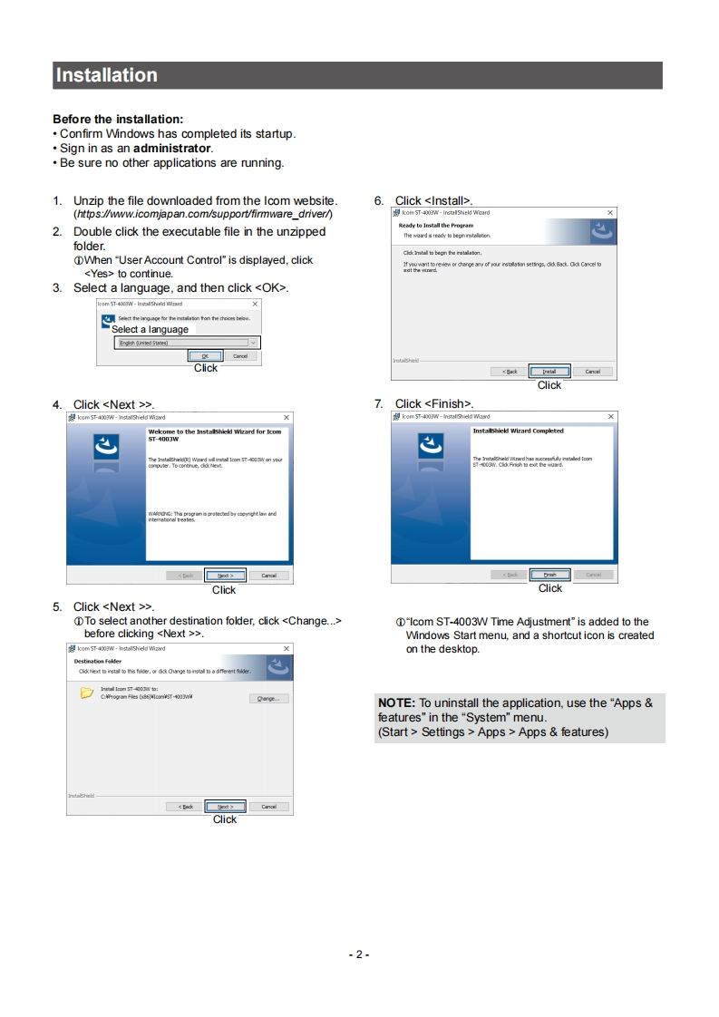 COMINSTRUCTIONSST-4003W is an Windows software that enables you toTIME ADJUSTMENT SOFTWAREeasily set the internal clock of the various Icom productsST-4003Wby connecting the PC and the product with a USB cable.System requirements(As of November 2021)Operating systemThis instruction document is based on ST-4003W versionMicrosoft Windows 11 (64 bit)1.00 and Windows 10.Microsoft Windows 10(32/64 bit)Display indications may differ,depending on the PC'sMicrosoft Windows 8.1 (32/64 bit)0S.Compatible radios and cablesWith this software,you can set the intemal clock ofthe Icom radios listed below.Connect your PC to12:00your radio through a USB cable.1200USB cablePCRadioCompatible radioRadio's USB port typeRequired item1C-705Micro-B1C-7100*Mini-B1C-7300Type-BPurchase the proper USB cable that matches your1C-7600Type-Bdevice's USB port.1C-7610Type-B"You can also use the supplied USB cable.1C-7850MC-7851Type-B1C-9700Type-BNOTE:Download the USB driver and the installation guide from the Icom websiteEnter the radio's model name into the Search box in the site.Icom websitehttps://www.icomjapan.com/support/Icom,Icom Inc.and the Icom logo are registered trademarks of Icom Incorporated (Japan)in Japan,the United States,the United Kingdom,Germany.France,Spain,Russia,Australia,New Zealand,and/or other countries.Microsoft and Windows are trademarks of the Microsoft group of companies.All other products or brands are registered trademarks or trademarks of their respective holders.-1-