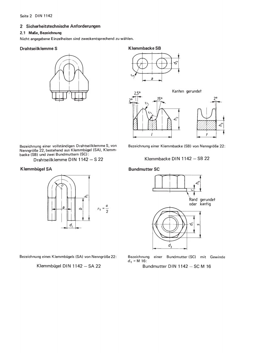 DK621.885:677.72:621.86:614.8 DEUTSCHE NORMJanuar 1982Drahtseilklemmen fur Seil-Endverbindungen正bei sicherheitstechnischen Anforderungen1142Wire rope grips for rope terminations;to meet safety requirementsErsatz fur Ausgabe 10.75Diese Norm enthalt sicherheitstechnische Festlegungen im Sinne des Geratesicherheitsgesetzes.Beginn der GultigkeitDiese Norm gilt ab 01.01.1982Daneben gilt DIN 1142,Ausgabe 10.75 noch bis zum 30.06.1982.MaBe in mm1 AnwendungsbereichDrahtseilklemmen nach dieser Norm sind zur Herstellung von losbarenSeil-Endverbindungen bestimmt,wenn an diese sicherheitstechnischeAnforderungen gestellt werden,d.h.wenn durch das Versagen der Seil-Endverbindung Personen oder Sachwerte gefahrdet werden konnen(sieheErlauterungen).Drahtseilklemmen nach dieser Norm durfen nicht fur Bergbau-Forder-seile,in Seiltrieben fur Hutten-und Walzwerkskrane und fur die dauerndeBefestigung von Seilen in anderen Seiltrieben,die nach DIN 15020 Teil 1berechnet werden,verwendet werden.Ferner durfen sie nicht fur Seil-Endverbindungen bei Lastaufnahmeeinrichtungen im Hebezeugbetriebeingesetzt werden,ausgenommen bei Anschlagmitteln,die jeweils fureine spezielle einmalige Verwendung hergestellt werden.Fortsetzung Seite 2 bis 5NormenausschuB Stahldraht und Stahldrahterzeugnisse(NAD)im DIN Deutsches Institut fur Normung e.V.NormenausschuB Mechanische Verbindungselemente (FMV)im DINAlleinverkaut der Normen durch Beuth Verlag GmbH,Berlin 3001.82DIN 1142 Jan 1982 Preisgr.6Vertr.-Nr.0006