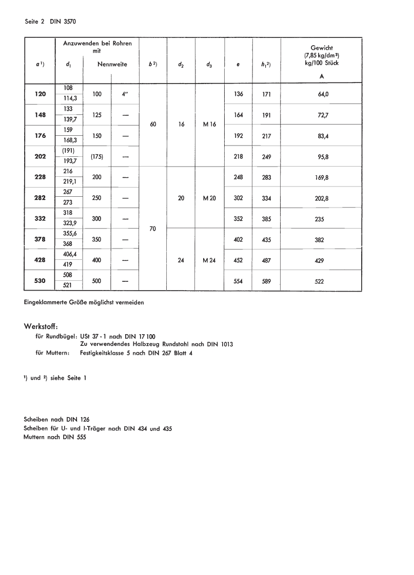 DK621.885.9:621.643DEUTSCHE NORMENOktober 1968Rundstahlbugel瓜fur Rohre von NW 20 bis 5003570Steel strap for nominal diameter 20 to 500 tubesMaBe in mmForm AForm Bfur Rohre aller Nennweitenfur Rohre der Nennweiten bis 80Bezeichnung eines Rundstahlbugels Form A mit einem lichten Durchmesser a =82 mm ohne Muttern und Scheiben:Rundstahlbigel A82 DIN 3570(Zugehorige Muttern und Scheiben sind besonders zu bestellen.)Anzuwenden bei RohrenGewichtvon(7,85 kg/dm3)a1)Nennweiteb2)d2h2)kg/100 StuckAB2530204”40407028946,826.930382548763110,57,733.710M1038321%”568612,09,042,444,552401⅓”62924012,99,748,3576450250761094922216,860312M128276,1652%”94125少25,919,894889803”1061386628,822,4Die Gewichte sinderrechnet fur Rundstahlbugel ohne Muttern und Scheiben.18961)Entspricht annahernd dem AuBendurchmesser des zugehorigen Rohres zuzuglich der zulassigen MaBabweichungen.2)b und h:sind MindestmaBe und gelten fur eine Plattendicke von 10 mm.Gegenuber der Tabelle abweichendeMaBe sind bei Bestellung besonders anzugeben;die Bezeichnung lautet dann fur einen Rundstahlbugel Form A miteinem lichten Durchmesser a =82 mm und z.B.=130 mm und b=55 mm:Rundstahlbige1A82×130×55D1N3570Fortsetzung Seite 2Fachnormenausschuf Rohre,Rohrverbindungen und Rohrleitungen im Deutschen Normenausschuf(DNA)Alleinverkauf der Normblatter durch Beuth-Vertrieb GmbH,Berlin 30 und KolnDIN 3570 Okt.1968 Preisgr.210.63