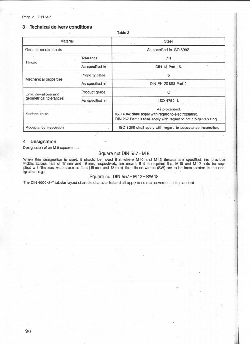 UDC621.882.33January 1994Product grade C square nutsN557Vierkantmuttern;Produktklasse CSupersedes February 1985 edition.In keeping with current practice in standards published by the International Organization for Standardization (ISO),a comma has been used throughout as the decimal marker.The new widths across flats 16 mm and 18 mm as specified in ISO 272 shall be used instead of the previouswidths across flats 17 mm and 19 mm for thread sizes M 10 and M 12:see clause 4 for example of designation.It is intended to omit the obsolescent widths across flats by 1 January 1999 at the latestDimensions in mm1 Scope and field of applicationThis standard specifies requirements for M 10 to M 12 square nuts assigned to product grade C.See DIN 962(orthe standards referred to therein)for special nut types or finishes.If,in special cases,nuts are to comply with specifications other than those given in this standard (e.g.regardingproperty class or material),these shall be selected in accordance with the relevant standards.2 DimensionsCountersinkpermitted.15to309mw is the minimum wrenching height;for this zone,the minimum value of e shall be maintained.Table 1Thread size(d)M5M6M8M10M12M16P)0,811251,51,752dwmin.6,78,711.514.515.516,517,222max.11314118,422,62425.426.933.9min.9,9312.5316,3420,2421,5422,8424.0230,11max nominal size456.510m13min.3,524,525,927,429,4212,3mwmin.253,2415,26,68.6max.=nominal size810131617181924min.7.649.6412,5715.5716.5717.5718,4823,16Mass per 1000 units2),in kg1,312,775,510,71316,319,1382')P=Pitch of thread(coarse pitch thread).2)Approximate value,with o=7,85 kg/dm3Continued on pages 2 and 3.