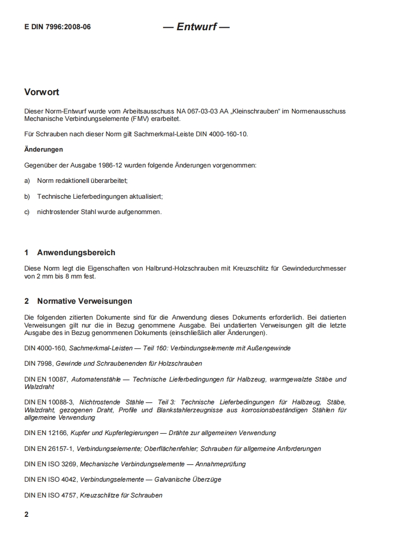 DEUTSCHE NORMEntwurfJuni 2008DIN 7996DIN1CS21.060.10Einspruche bis 2008-09-14Vorgesehen als Ersatz furEntwurfD1N7996:1986-12Halbrund-Holzschrauben mit KreuzschlitzCross recessed pan head wood screwsVis a bois a tete ronde a empreinte cruciformeAnwendungswarnvermerkDieser Norm-Entwurf mit Erscheinungsdatum 2008-05-14 wird der Offentlichkeit zur Prufung undStellungnahme vorgelegt.Weil die beabsichtigte Norm von der vorliegenden Fassung abweichen kann,ist die Anwendung diesesEntwurfes besonders zu vereinbaren.Stellungnahmen werden erbetenvorzugsweise als Datei per E-Mail an fmv@din.de in Form einer Tabelle.Die Vorlage dieser Tabelle kannim Intemet unter www.din.de/stellungnahme abgerufen werden;oder in Papierform an den Normenausschuss Mechanische Verbindungselemente(FMV)im DIN,10772 Berlin (Hausanschrift:Burggrafenstr.6,10787 Berlin).Die Empfanger dieses Norm-Entwurfs werden gebeten,mit ihren Kommentaren jegliche relevantePatentrechte,die sie kennen,mitzuteilen und unterstutzende Dokumentationen zur Verfugung zu stellen.Gesamtumfang 6 SeitenNormenausschuss Mechanische Verbindungselemente(FMV)im DIN