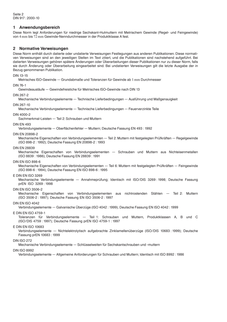DEUTSCHE NORMOktober 2000Sechskant-Hutmuttern,niedrige FormDIN9171CS21.060.20Ersatz furD1N917:2000-02Hexagon cap nuts,low typeEcrous hexagonaux borgnes a calotte,type basseVorwortDiese Norm wurde vom FMV 3.1 Schrauben und Muttern mit AuBenantrieb"erarbeitet.AnderungenGegenuber DIN 917:1987-06 wurden folgende Anderungen vorgenommen:a)Fur die Gewinde-NenngroBen M10,M12,M14 und M22 wurden die Schlusselweiten 17mm,19mm,22 mm und32 mm gestrichen.b)Die normativen Verweisungen wurden aktualisiert.c)Die Wertemin wurden korrigiert.Gegenuber DIN 917:2000-02 wurden folgende Berichtigungen vorgenommen:a)Bezeichnung der Gewinde-NenngroBen M10,M12,M14 und M22 durch Angabe der Schlusselweite erganzt.b)Bezeichnungsbeispiele im Abschnitt 5 berichtigt.Fruhere AusgabenDlN917:1970-12.1977-04.1987-06,2000-02DlN917-1:1942-04,1953-10.1963-03Fortsetzung Seite 2 bis 6NormenausschuB Mechanische Verbindungselemente (FMV)im DIN Deutsches Institut fur Normung e.V.