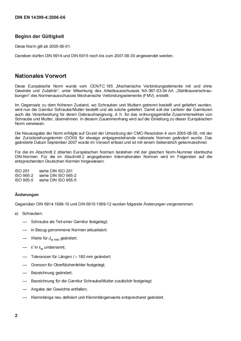 DEUTSCHE NORMJuni 2006DIN EN 14399-4DIN1CS21.060.10;21.060.20Ersatz furDIN EN14399-42005-06Siehe jedoch Beginn derGultigkeitHochfeste planmaBig vorspannbare Schraubenverbindungen fur denMetallbauTeil 4:System HV-Garnituren aus Sechskantschrauben und -muttern;Deutsche Fassung EN 14399-4:2005High-strength structural bolting assemblies for preloading-Part 4:System HV-Hexagon bolt and nut assemblies;German version EN 14399-4:2005Boulonnerie de construction metallique a haute resistance apte a la precontrainte-Partie 4:Systeme HV-Boulons a tete hexagonale(vis ecrou);Version allemande EN 14399-4:2005Gesamtumfang 21 SeitenNormenausschuss Mechanische Verbindungselemente(FMV)im DINNormenausschuss Bauwesen(NABau)im DIN