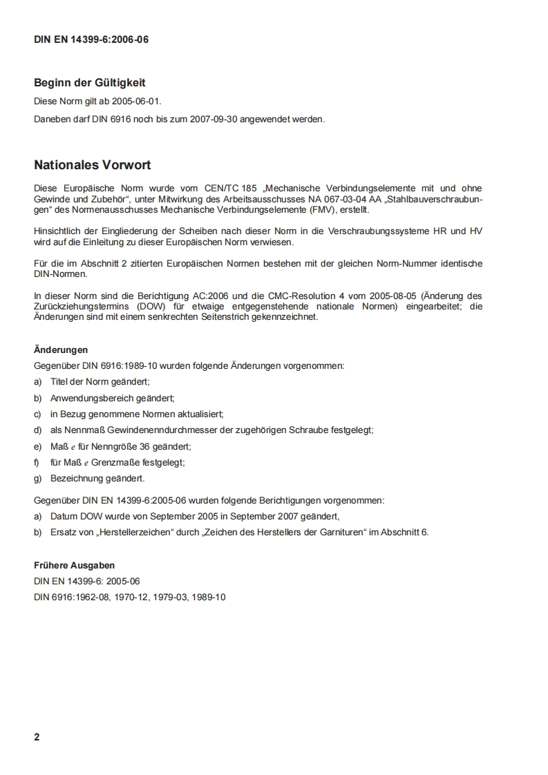 DEUTSCHE NORMJuni 2006DIN EN 14399-6DIN1CS21.060.30Ersatz furDIN EN14399-62005-06Siehe jedoch Beginn derGultigkeitHochfeste planmaBig vorspannbare Schraubenverbindungen fur denMetallbauTeil 6:Flache Scheiben mit Fase;Deutsche Fassung EN 14399-6:2005+AC:2006High-strength structural bolting assemblies for preloading-Part 6:Plain chamfered washers;German version EN 14399-6:2005+AC:2006Boulonnerie de construction metallique a haute resistance apte a la precontrainte-Partie 6:Rondelles plates chanfreinees;Version allemande EN 14399-6:2005 AC:2006Gesamtumfang 10 SeitenNormenausschuss Mechanische Verbindungselemente(FMV)im DINNormenausschuss Bauwesen (NABau)im DIN
