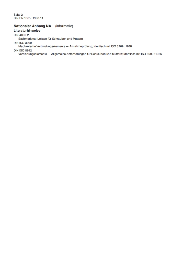 DEUTSCHE NORMNovember 1998Sechskantschrauben mit FlanschNschwere ReiheDeutsche Fassung EN 1665:1997EN16651CS21.060.10Ersatz furAusgabe 1998-02Deskriptoren:Verbindungselement,Sechskantschraube,EigenschaftHexagon bolts with flange,heavy series:German version EN 1665:1997Vis a tete hexagonale a embase cylindro-tronconique,serie large;Version allemande EN 1665:1997Die Europaische Norm EN 1665:1997 hat den Status einer Deutschen Norm.Nationales VorwortAuf internationaler Ebene gingen die Meinungen,ob eine Norm fur Flanschschrauben der schweren Reihe nebendenen der leichten Reihe uberhaupt benotigt wird,auseinander.Das ursprunglich hierfur vorgesehene NormvorhabenISO 8102 wurde deshalb eingestelltDie europaischen Lander sahen jedoch mehrheitlich die Notwendigkeit fur eine solche Norm und erstellten auf derGrundlage des Internationalen Norm-Entwurfs ISO/DIS 8102:1991 diese Europaische Norm.Dabei wurde jedoch furdie NenngroBe M10 die Schlusselweite 16 mm festgelegt,die international fur Flanschprodukte zur Zeit nicht durch-setzbar ist.Dort gilt,wie auch in anderen ISO-Normen,die Schlusselweite 15 mm(siehe z.B.ISO 4161 und ISO 4162).Fur die im Abschnitt 2 zitierten Internationalen Normen wird im folgenden auf die entsprechenden Deutschen Normenhingewiesen:1S03269siehe DIN ISO 32691S08992siehe DIN ISO 8992Sachmerkmal-LeisteFur Schrauben nach dieser Norm gilt Sachmerkmal-Leiste DIN 4000-2-7.AnderungenGegenuber DIN 6921:1983-06 und DIN 6922:1983-06 wurden folgende Anderungen vorgenommen:a)Schrauben mit Feingewinde entfallen.(Sie sollen zu einem spateren Zeitpunkt in eine separate Norm auf-genommen werden.)b)MaBbuchstabe du durchd ersetzt.c)MaBe d geandertd)MaBbuchstabe fdurch Iersetzt.e)MaBe lrgeandert.f)MaBek geandertg)MaBbuchstabek'durchw ersetzth)MaBe kw geandert.i)MaBe r bis r4 geandert.j)Fur Schrauben mit Gewinde M10,M12,M14,M16 und M20 Schlusselweiten geandert.k)MaBbuchstabe u durch g ersetzt.Fur Schrauben mit Gewinde bis Kopf MaBangaben/gx entfallen.m)Festigkeitsklasse 12.9 entfallen.n)Anhang A"Prufung mit der Kopf-und Flanschlehre"aufgenommen.Gegenuber der Ausgabe Februar wurden folgende Berichtigungen vorgenommen:-Tabelle 1,Werte fur sax berichtigt.Fruhere AusgabenDlN6921:1983-06DIN6922:1983-06DIN EN1665:1998-02Fortsetzung Seite 2und 7 Seiten ENNormenausschuB Mechanische Verbindungselemente(FMV)im DIN Deutsches Institut fur Normung e.V.