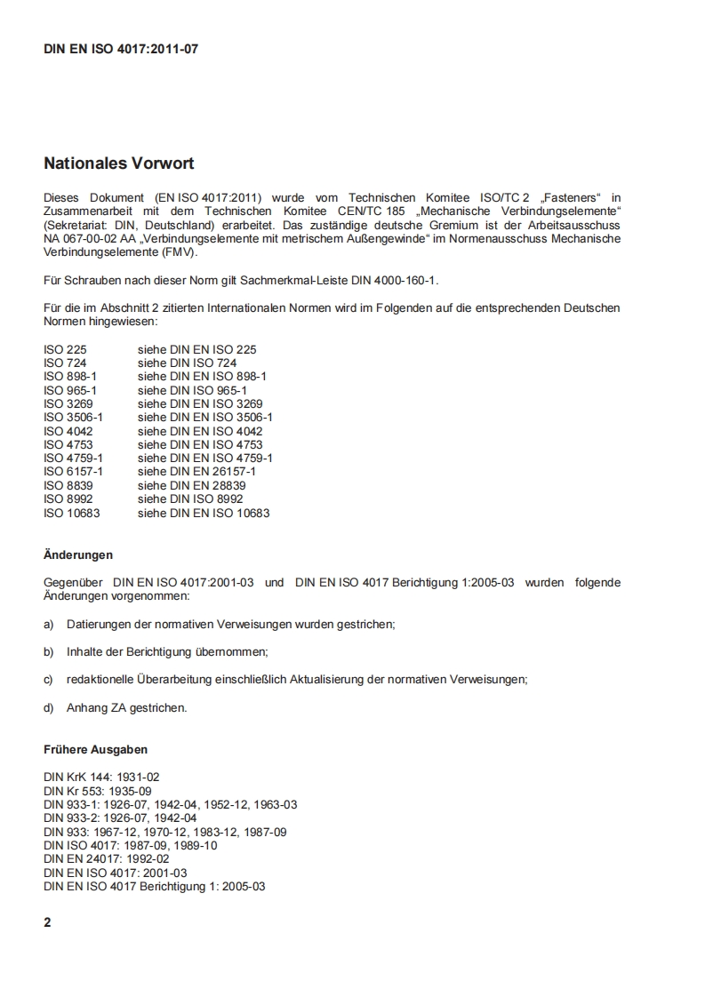 DEUTSCHE NORMJuli 2011DIN EN ISO 4017DIN1CS21.060.10Ersatz furDIN EN ISO 4017:2001-03 undDIN EN ISO 4017Berichtigung 1:2005-03Sechskantschrauben mit Gewinde bis Kopf-Produktklassen A und B(ISO 4017:2011);Deutsche Fassung EN ISO 4017:2011Hexagon head screws-Product grades A and B(ISO 4017:2011);German version EN ISO 4017:2011Vis a tete hexagonale entierement filetees-Grades A et B(ISO 4017:2011);Version allemande EN ISO 4017:2011Gesamtumfang 18 SeitenNormenausschuss Mechanische Verbindungselemente(FMV)im DIN