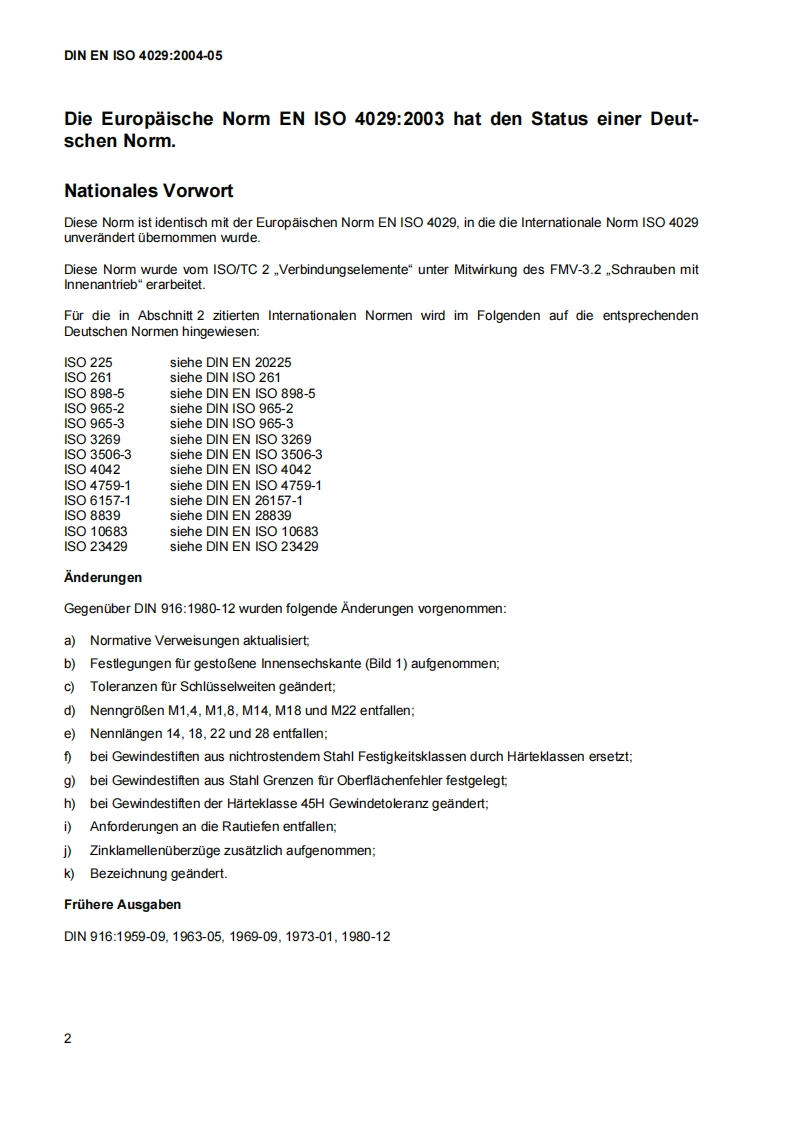 DEUTSCHE NORMMai 2004DIN EN ISO 4029DIN1CS21.060.10Ersatz furDIN916:1980-12Gewindestifte mit Innensechskant und Ringschneide(ISO 4029:2003);Deutsche Fassung EN ISO 4029:2003Hexagon socket set screws with cup point(ISO 4029:2003);German version EN ISO 4029:2003Vis sans tete a six pans creux et cuvette(ISO 4029:2003);Version allemande EN ISO 4029:2003Gesamtumfang 11 SeitenNormenausschuss Mechanische Verbindungselemente (FMV)im DIN