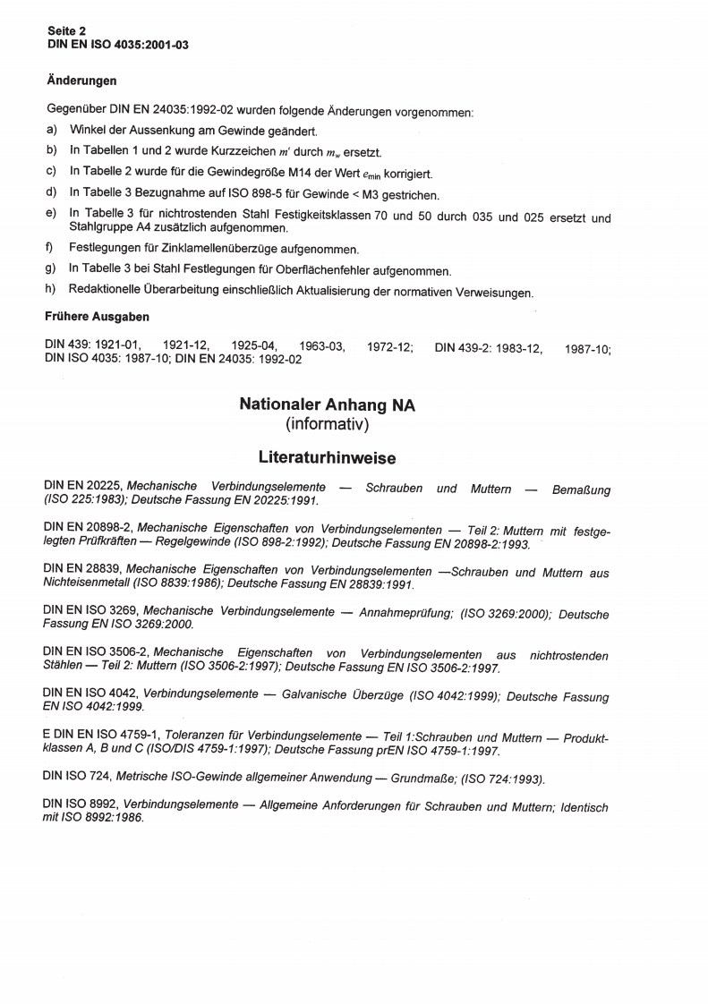 DEUTSCHE NORMMarz 2001Sechskantmuttern,niedrige Form(mit Fase)Produktklassen A und BD瓜(1S04035:1999)Deutsche Fassung EN ISO 4035:2000EN ISO 40351CS21.060.20Ersatz furDIN EN24035:1992-02Hexagon thin nuts (chamfered)-Product grades A and B(ISO 4035:1999);German version EN ISO 4035:2000Ecrous bas hexagonaux(chanfreines)-Grades A et B(ISO 4035:1999):Version allemande EN ISO 4035:2000Nationales VorwortDiese Norm ist identisch mit der Europaischen Norm EN ISO 4035,in die die Internationale NormISO 4035 unverandert ubernommen wurde.Diese Europaische Norm wurde unter Mitwirkung des Arbeitsausschusses FMV-3.1Schrauben und Mut-tern mit AuBenantrieb"erstellt.Fur die im Abschnitt 2 zitierten Internationalen Normen wird im Folgenden auf die entsprechenden Deut-schen Normen hingewiesen:IS0225siehe DIN EN 202251S0724siehe DIN ISO 7241S0898-2siehe DIN EN 20898-2IS03269siehe DIN EN ISO 32691S03506-2siehe DIN EN ISO 3506-2IS04042siehe DIN EN ISO 4042ISO/DIS 4759-1 siehe E DIN EN ISO 4759-11S08839siehe DIN EN 288391S08992siehe DIN ISO 8992Fortsetzung Seite 2und 9 Seiten ENNormenausschuss Mechanische Verbindungselemente(FMV)im DIN Deutsches Institut fur Normung e.V.DIN Deutsches Institut fur Normung e.V.Jede Art der Vervielfaltigung.auch auszugsweise,Ref.Nr.D1WEW1S04035:2001-03nur mit Genehmigung des DIN Deutsches Institut far Normung e.V.,Berlin,gestattet.Preisgr.08Vertr.-Nr.2308Alleinverkauf der Normen durch Beuth Verlag GmbH,10772 Berlin