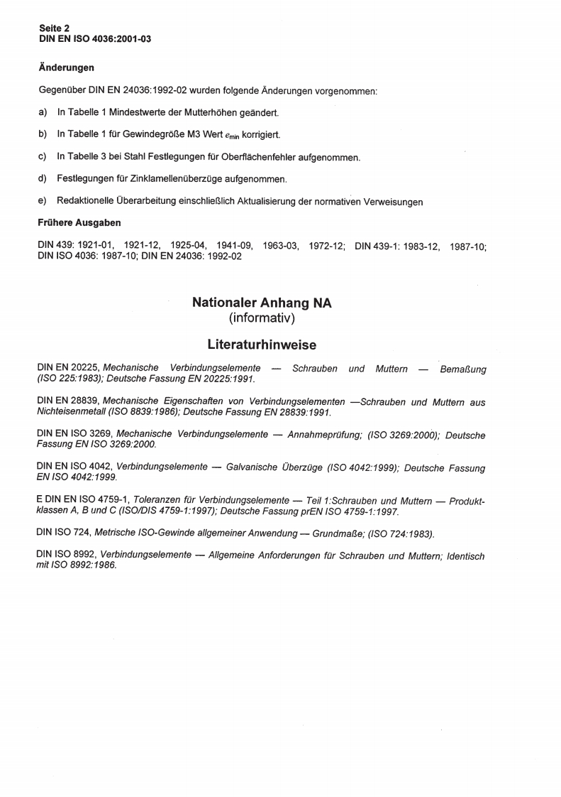 DEUTSCHE NORMMarz 2001Sechskantmuttern niedrige Form (ohne Fase)Produktklasse B(ISO 4036:1999)DINDeutsche Fassung EN ISO 4036:2000EN ISO 40361CS21.060.20Ersatz furD1NEN24036:1992-02Hexagon thin nuts (unchamfered)-Product grade B(ISO 4036:1999);German version EN ISO 4036:2000Ecrous bas hexagonaux (sans chanfrein)-Grade B(ISO 4036:1999):Version allemande EN ISO 4036:2000Nationales VorwortDiese Norm ist identisch mit der Europaischen Norm EN ISO 4036,in die die Internationale NormISO 4036 unverandert ubernommen wurde.Diese Europaische Norm wurde unter Mitwirkung des Arbeitsausschusses FMV-3.1 Schrauben und Mut-tern mit AuBenantrieb"erstellt.Fur die im Abschnitt 2 zitierten Internationalen Normen wird im Folgenden auf die entsprechenden Deut-schen Normen hingewiesen:1S0225siehe DIN EN 202251S0724siehe DIN ISO 7241S03269siehe DIN EN ISO 32691S04042siehe DIN EN ISO 4042ISO/DIS 4759-1 siehe E DIN EN ISO 4759-11S08839siehe DIN EN 288391S08992siehe DIN ISO 8992ANMERKUNG In der NORM ISO 4036:1999 liegt ein Fehler in Bild 1 vor,der in der europaischen NormEN ISO 4036:2000 korrigiert wurde,siehe FuBnote zu Bild 1.Fortsetzung Seite 2und 7 Seiten ENNormenausschuss Mechanische Verbindungselemente(FMV)im DIN Deutsches Institut fur Normung e.V.DIN Deutsches Institut for Normung e.V.Jede Art der Vervielfaltigung.auch auszugsweise.Ref.Nr.DIN EN ISO 4036:2001-03nur mit Genehmigung des DIN Deutsches Institut for Normung e.V.,Berlin.gestattet.Preisgr.07Vertr.-Nr.2307Alleinverkauf der Normen durch Beuth Verlag GmbH.10772 Berlin