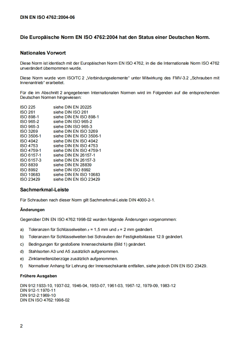 DEUTSCHE NORMJuni 2004DIN EN ISO 4762DIN1CS21.060.10Ersatz furDIN EN IS04762:1998-02Zylinderschrauben mit Innensechskant(ISO 4762:2004);Deutsche Fassung EN ISO 4762:2004Hexagon socket head cap screws(ISO 4762:2004);German version EN ISO 4762:2004Vis a tete cylindrique a six pans creux(ISO 4762:2004);Version allemande EN ISO 4762:2004Gesamtumfang 18 SeitenNormenausschuss Mechanische Verbindungselemente (FMV)im DIN