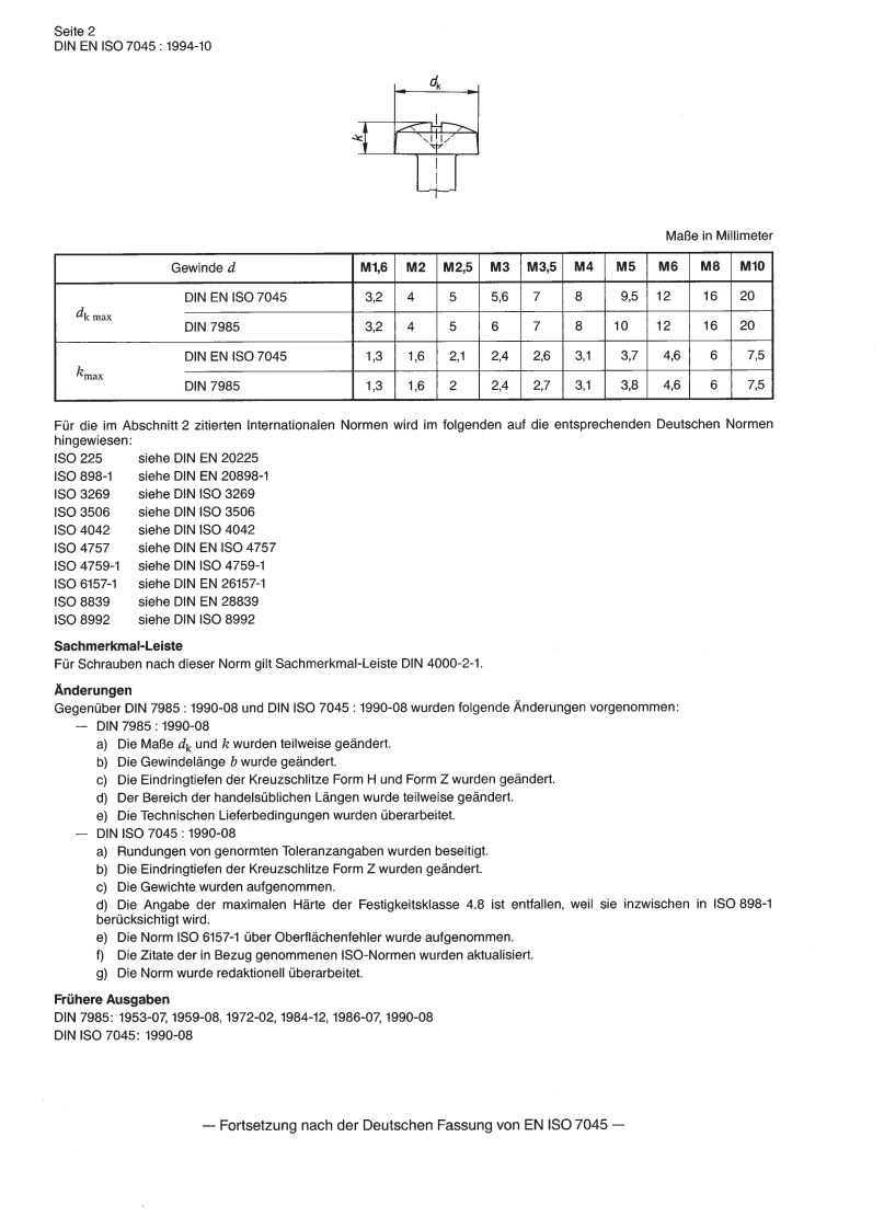 DEUTSCHE NORMOktober 1994Flachkopfschrauben mit KreuzschlitzForm H oder Form Z正Produktklasse A(ISO 7045 1994)EN ISO 7045Deutsche Fassung EN ISO 7045:19941CS21.060.10Ersatz furDIN7985:1990-08Deskriptoren:Verbindungselement,Schraube,Flachkopfschraube.undKreuzschlitzschraube,AbmessungDIN IS07045:1990-08Pan head screws with type H or type Z cross recess-Product grade A(ISO 7045:1994);German version EN ISO 7045:1994Vis a metaux a tete cylindrique bombee large a empreinte cruciforme de type H ou detype Z-Grade A(ISO 7045:1994):Version allemande EN ISO 7045:1994Die Europaische Norm EN ISO 7045:1994 hat den Status einer Deutschen Norm.Nationales VorwortNachdem Deutschland die Internationalen Normen (ISO-Normen)uber Schlitz-und Kreuzschlitzschrauben sowie uberBlechschrauben bereits im Jahr 1990 unverandert als DIN-ISO-Normen ubernommen hatte,wurde nun in CEN/TC 185"Mechanische Verbindungselemente"beschlossen,diesen Schritt fur alle CEN-Mitgliedslander zu vollziehen unddiese ISO-Normen als Europaische Normen (EN-Normen)zu ubernehmen.Daruber hinaus wurden auch alle ISO-Nor-men,die damit in Zusammenhang stehen,namlich ISO-Normen uber mechanische Eigenschaften von Blechschrau-ben,uber Blechschraubengewinde,uber Kreuzschlitze sowie uber die Eindringtiefe von Kreuzschlitzen,als EN-Nor-men ubernommen.Die Norm ISO 7721 uber die Kopfgeometrie von Senkschrauben(ISO-Einheitskopf)war bereits imJahr 1992 als EN 27721 ubernommen worden,In diesem Zusammenhang ist jedoch darauf hinzuweisen,daB die ISO-Normen uber metrische Schlitz-und Kreuz-schlitzschrauben,die die Grundlage fur die im Jahr 1990 veroffentlichten DIN-ISO-Normen waren,inzwischen uber-arbeitet worden sind.Die jetzt angenommenen EN-ISO-Normen entsprechen den uberarbeiteten Fassungen dieserISO-Normen.Ihre Ubernahme in das Deutsche Normenwerk war deshalb,nach den geltenden Regeln,nur in Form vonDIN-EN-ISO-Normen moglich.Anders verhalt es sich bei den Blechschrauben.Die ISO-Normen uber Blechschrauben,die jetzt als EN-ISO-Normenangenommen wurden,sind noch die gleichen,die den oben erwahnten DIN-ISO-Normen zugrunde lagen.Ein Neu-druck in Form von DIN-EN-ISO-Normen war deshalb nicht gerechtfertigt,so daB die DIN-ISO-Normen uber Blech-schrauben lediglich uber eine in den DIN-Mitteilungen veroffentlichte Anerkennungsnotiz als Europaische Normenanerkannt wurden und somit weiterhin gultig sind.In allen Fallen gilt jedoch,daB die bisherigen DIN-Normen,die mit den jetzigen EN-ISO-Normen nicht identisch waren,zuruckgezogen werden muBten.Damit ist die auf den fruheren bzw.den noch gultigen DIN-ISO-Normen angegebeneUbergangsfrist fur die Zuruckziehung der bisherigen DIN-Normen gegenstandslos geworden.Im Nationalen Vorwortzu den DIN-ISO-Normen war bereits auf die Moglichkeit einer Verkurzung der Ubergangsfrist wegen laufender euro-paischer Normungsarbeiten hingewiesen worden.In den DIN-Mitt 73,1994,Nr.11,ist in dem Artikel "Europaische Normen uber Schlitzschrauben,Kreuzschlitzschraubenund Blechschrauben"eine tabellarische O